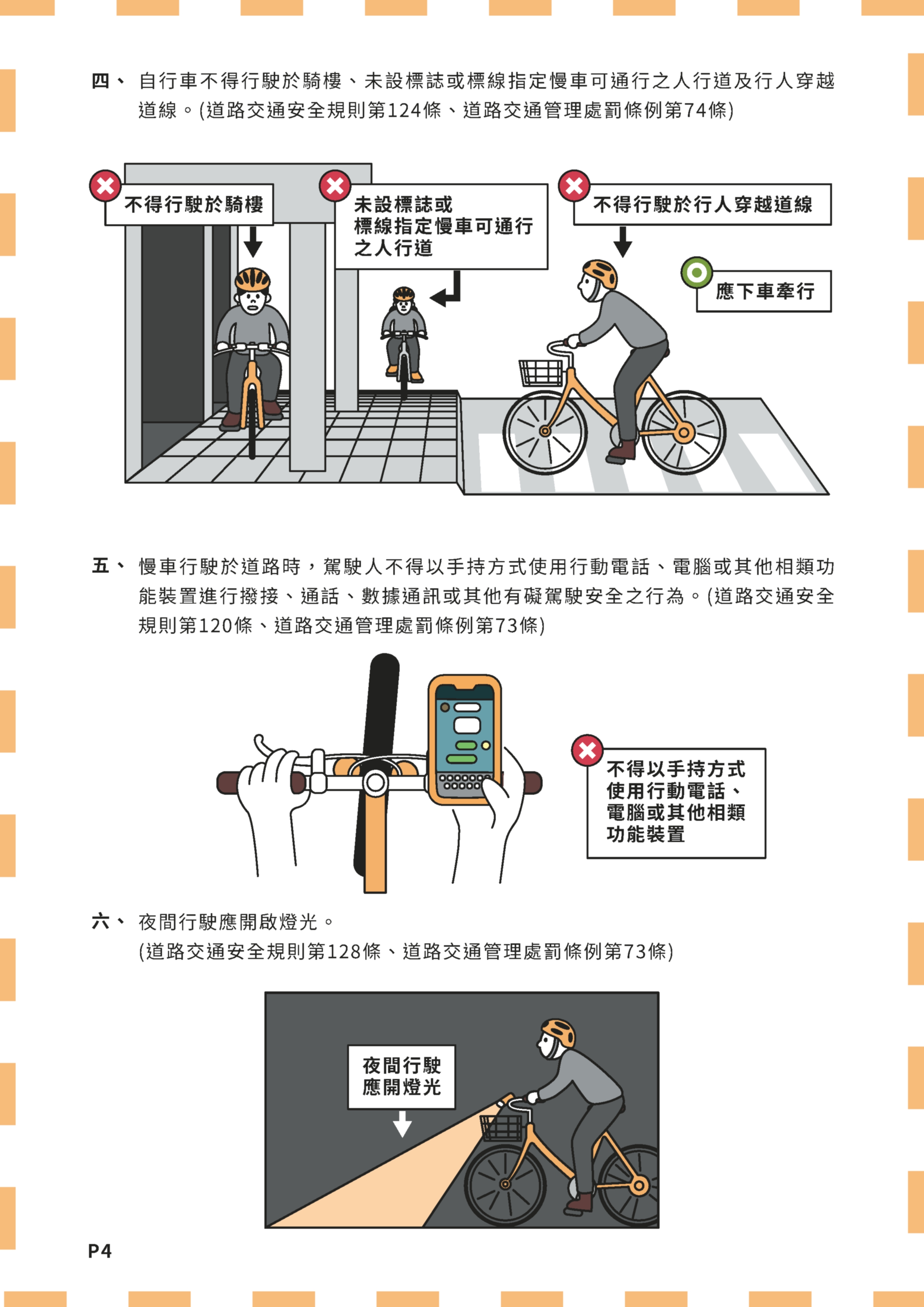 不可行駛於騎樓、應減速停讓行人,行經行人穿越線應下車牽行。