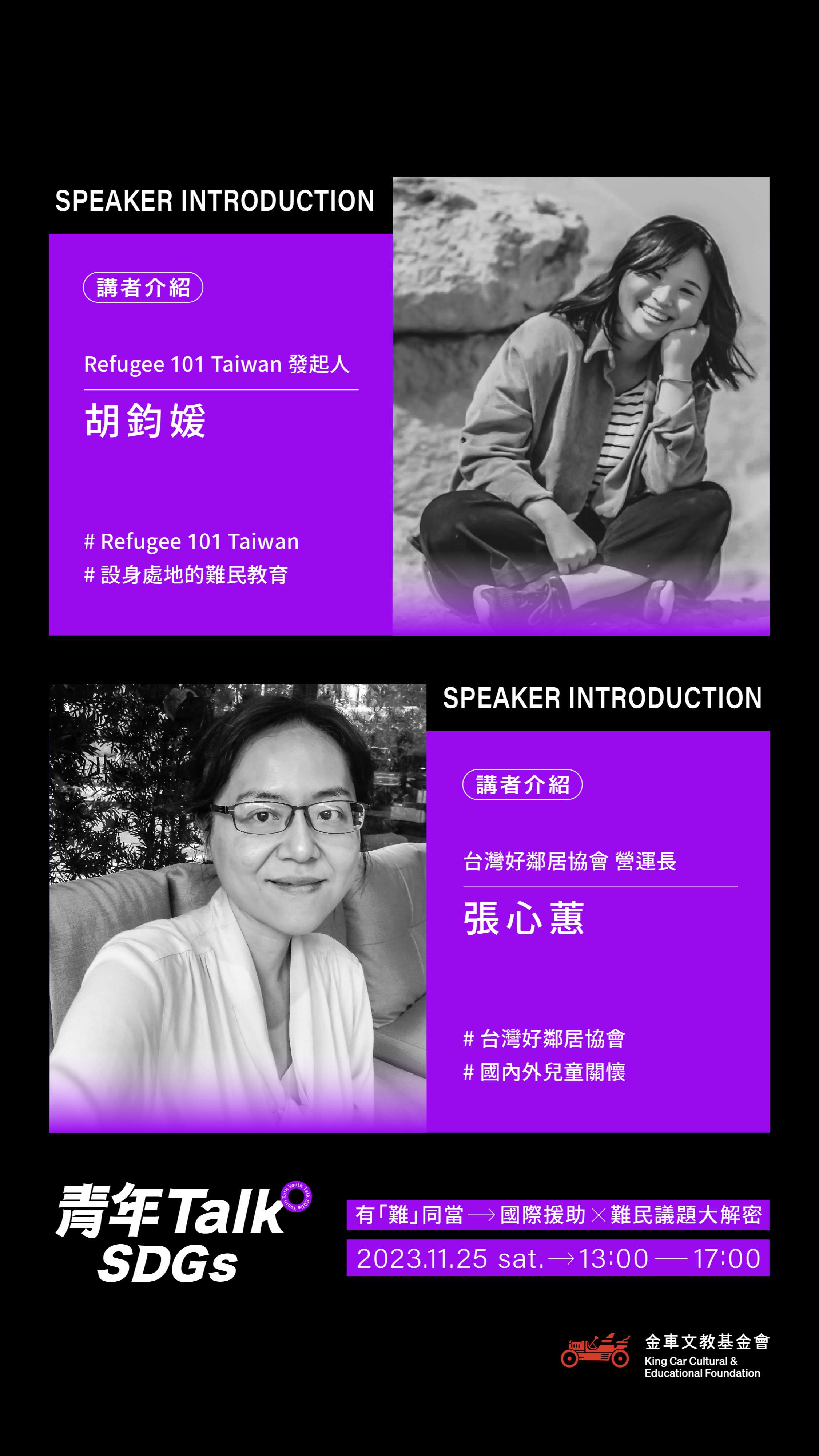 一、金車文教基金會本次邀請【台灣好鄰居協會】營運長張心蕙及【Refugee 101 Taiwan】發起人胡鈞媛,探討SDG16「促進和平多元的社會,確保司法平等,建立具公信力且廣納民意的體系」相關議題。透過兩位講者的分享與議題探討,期待更多青年朋友能激盪出框架外的想法與行動。