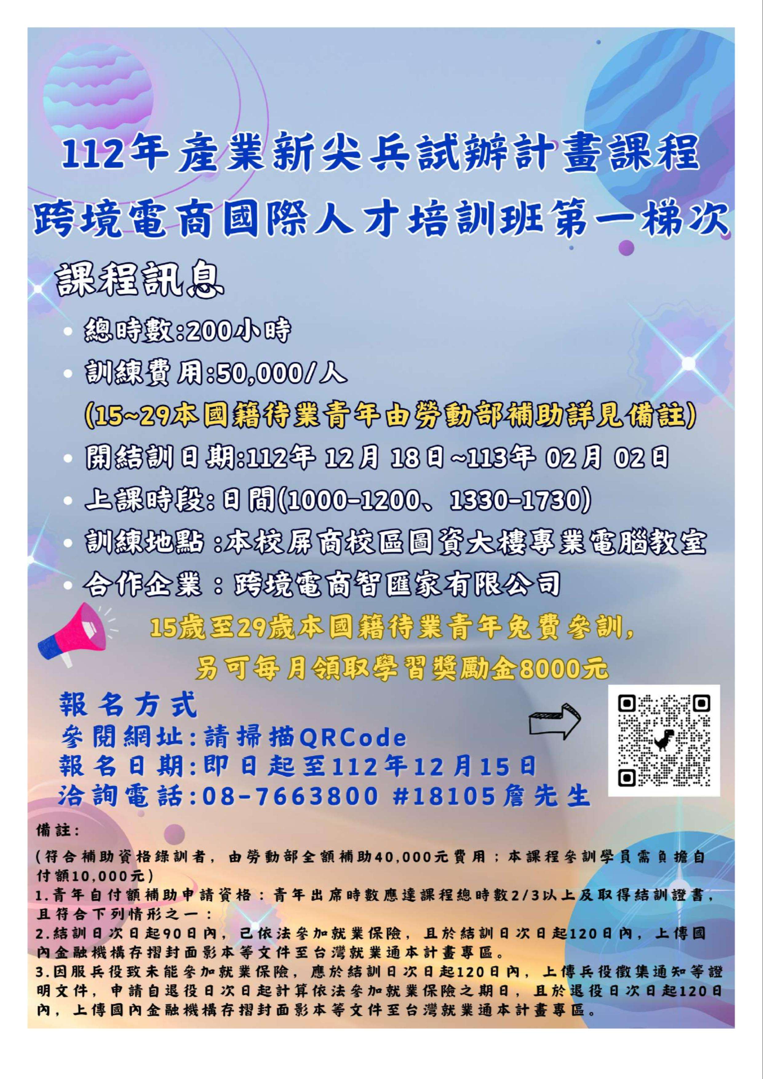 二、上課期間為112年12月18日~113年2月2日(週一至週五),課程費用每人50,000元(凡符合「產業新尖兵計畫」補助資格者,需先行繳交新臺幣10,000元訓練費用予訓練單位,結訓後符合條件者,勞動部勞動力發展署補助全額費用,詳見「產業新尖兵計畫」官方網站網址:https://elite.taiwanjobs.gov.tw/。