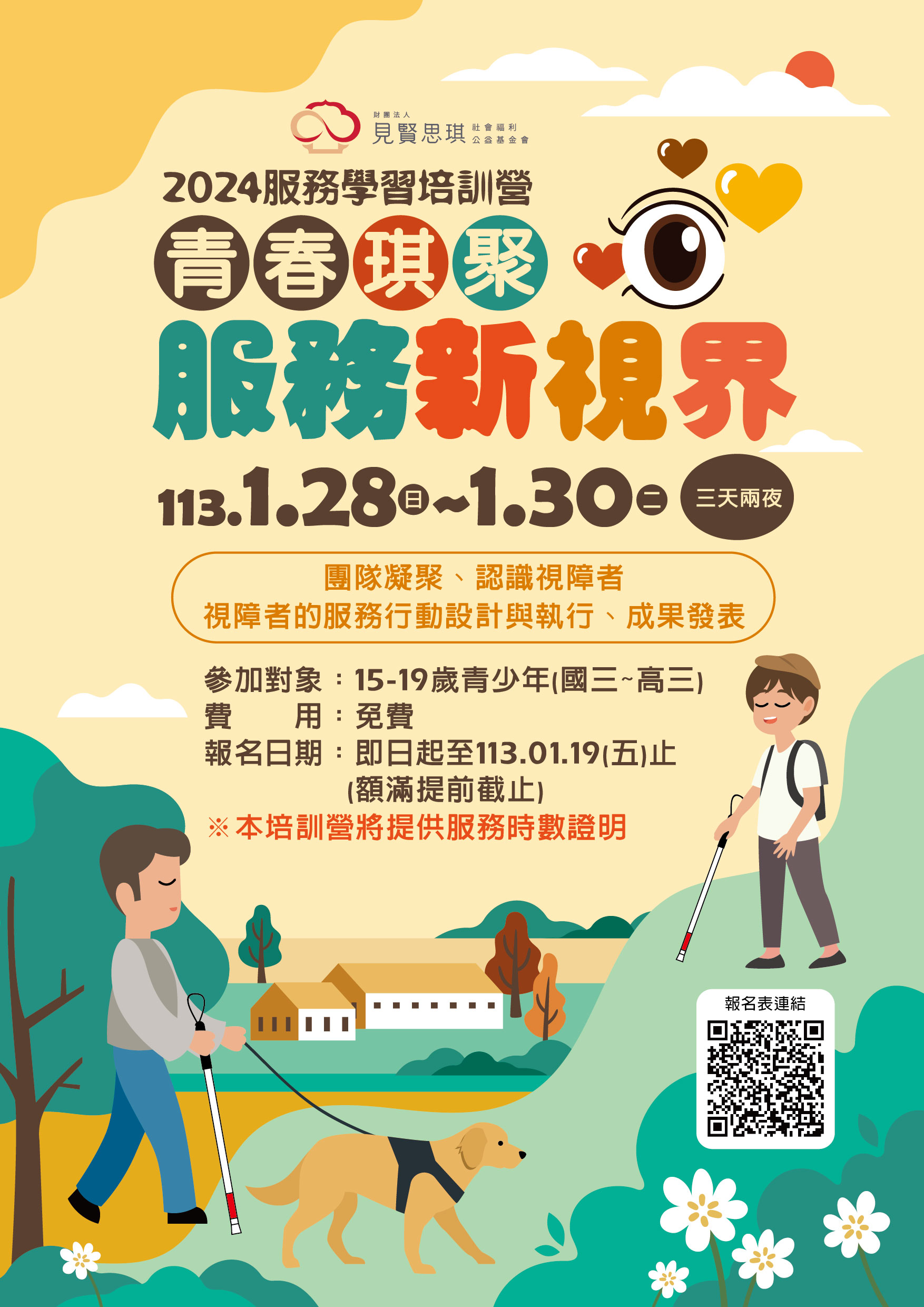 一、本會規劃辦理2024「青春琪聚-服務新視界」寒假服務學習培訓營;透過做中學提供社會參與機會,增進青少年對公共議題的關心,豐富其學習視野,歡迎有服務熱忱的青少年踴躍參與。
