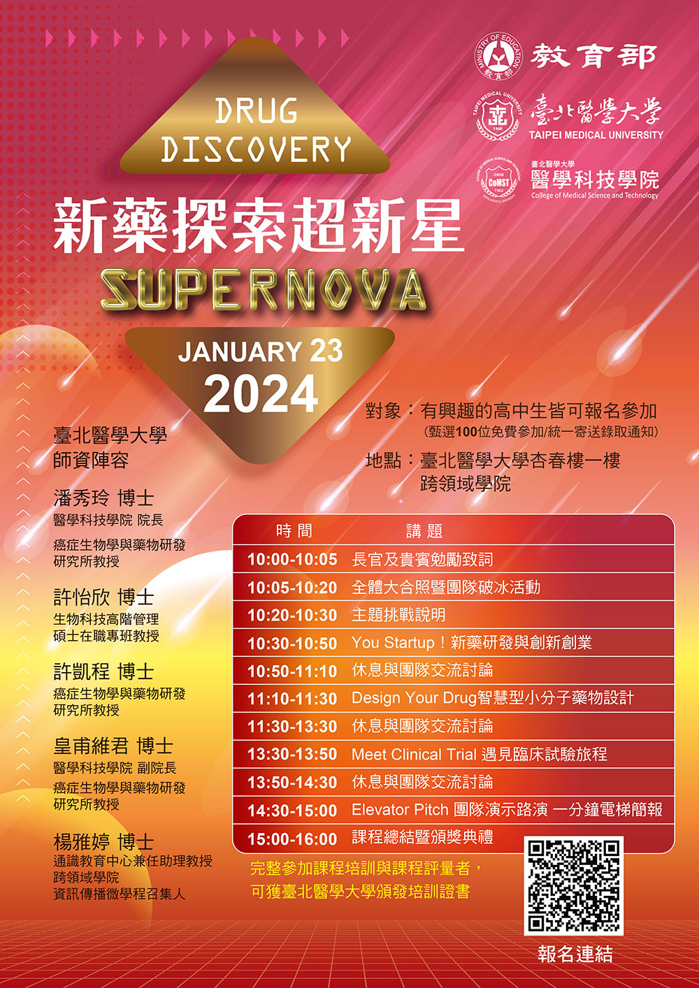說 明:臺北醫學大學醫學科技學院潘秀玲院長團隊執行教育部補助大專校院STEM領域及女性研發人才培育計畫,設計適配高中生學習之「Drug Discovery Supernova新藥探索超新星科普培訓計畫」課程活動。詳閱附件海報。