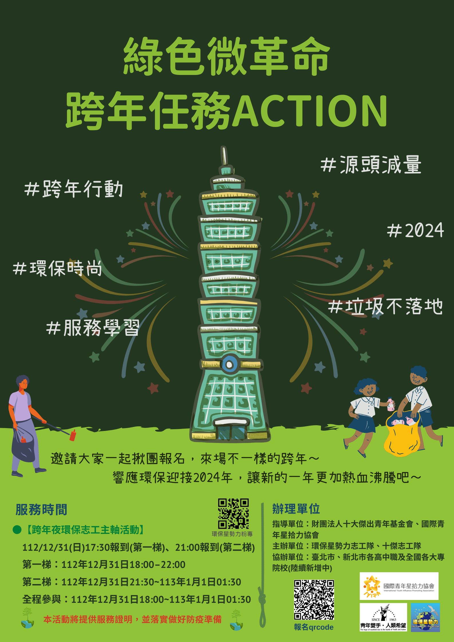 財團法人十大傑出青年基金會於今年12月31日下午17:30假本會輔導之青年志工團隊──環保星勢力志工隊辦理「2023-2024綠色微革命-跨年任務 ACTION」