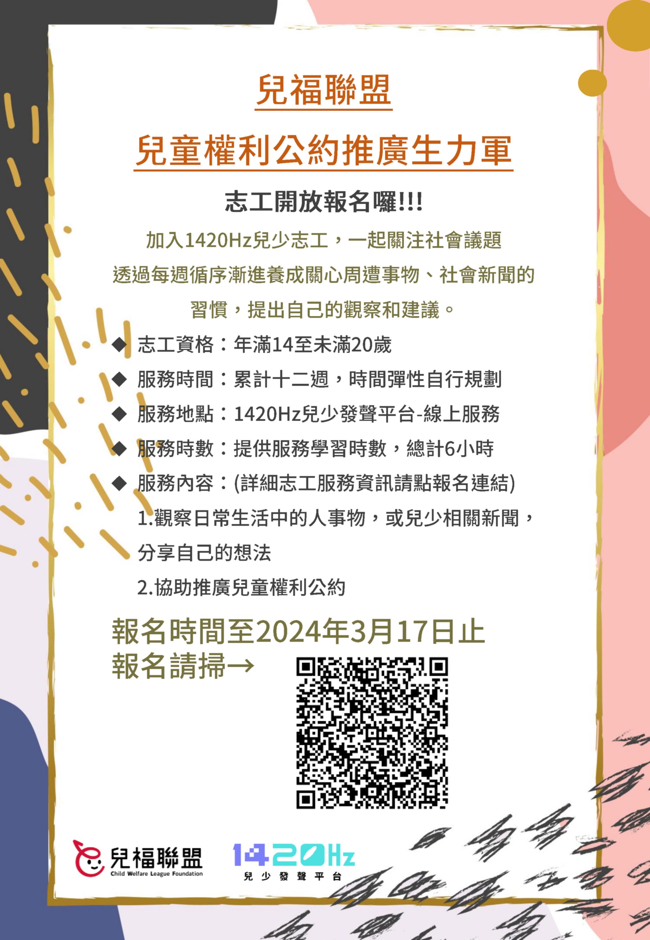 一、兒福聯盟長期致力於推廣及保障兒童權利,邀請兒少成為「兒童權利公約推廣生力軍」志工,透過線上學習認識兒童權利,將學習化為行動,協助推廣兒童權利公約。