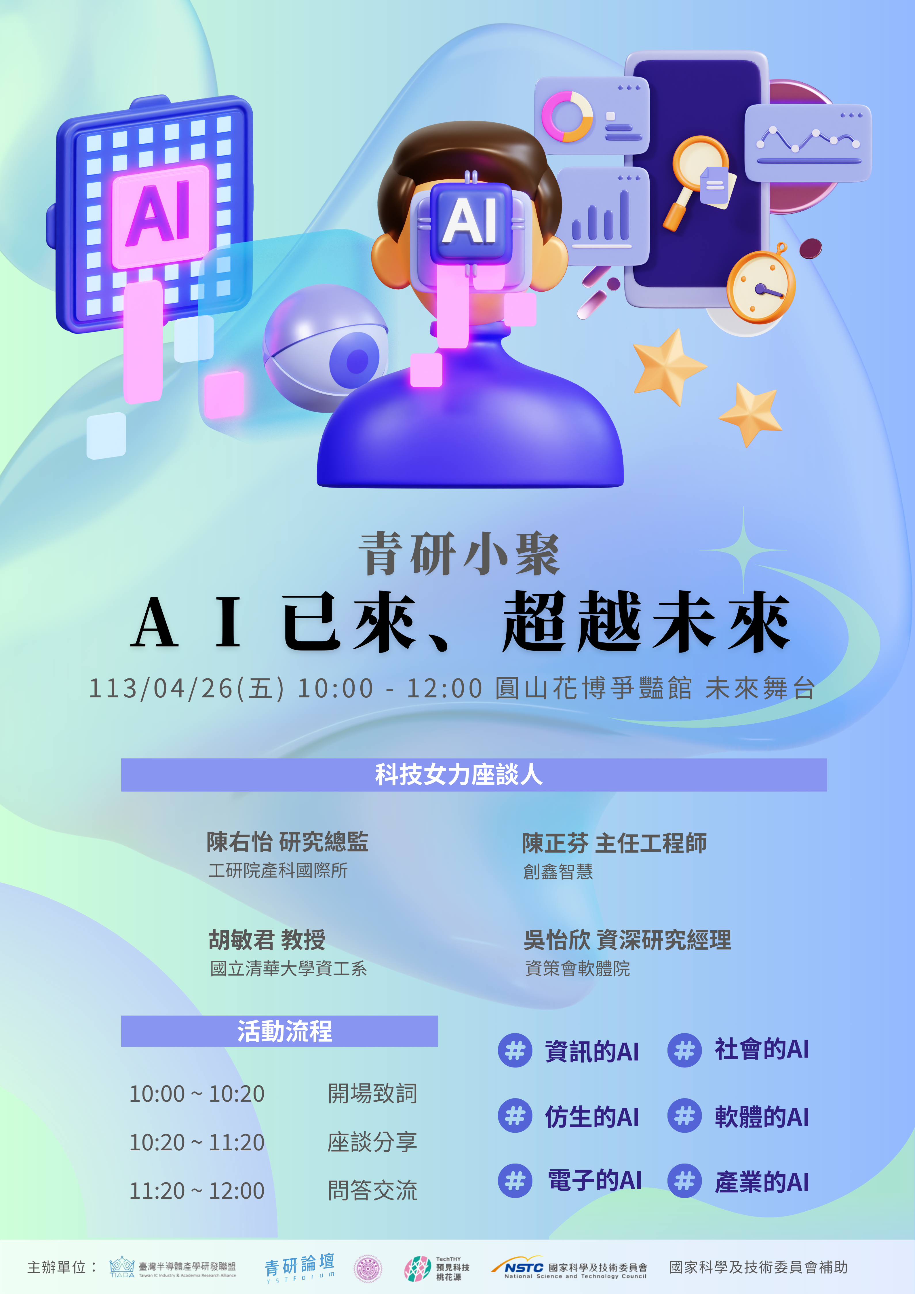一、半導體科研青年論壇(以下簡稱「青研論壇」)由臺灣半導體產學研發聯盟(以下簡稱TIARA)支持創辦。2023年啟動與「預見科技桃花源」等各界合作,聚焦女性對象,擴大辦理系列活動「青研小聚」主題座談會。本「AI已來,超越未來」場次,謹訂於113年 4 月 26 日10時至12時,假圓山花博爭豔館舉辦。