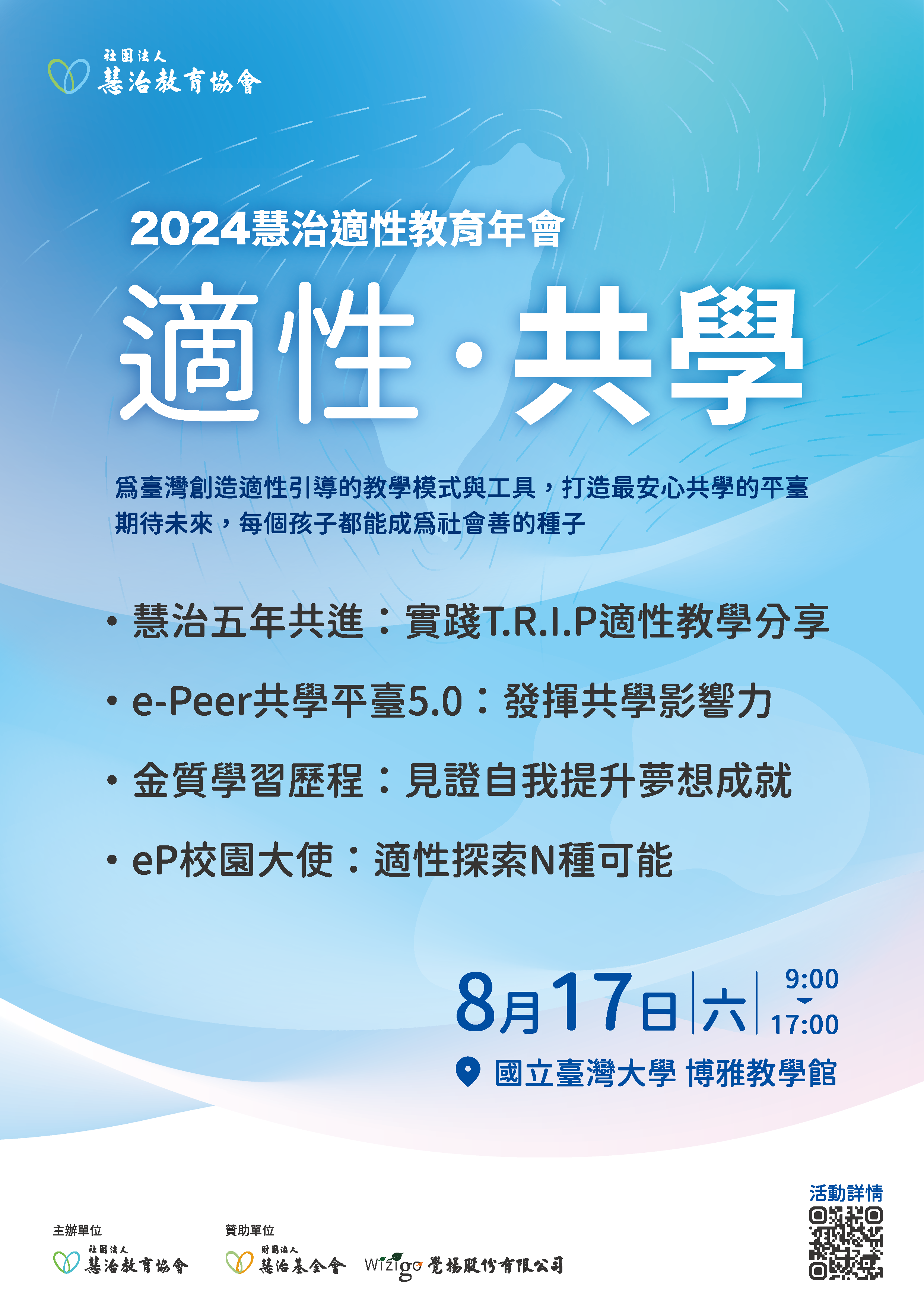 一、社團法人慧治教育協會長期關注教育議題,秉持適性揚才理念,推廣及落實「T.R.I.P.適性教學模式」,並搭配數位教學工具「e-Peer共學平臺」。邁入第五年的今年將首次辦理【慧治適性教育年會】,以「適性‧共學」向全臺的師生及教育單位分享歷年來的實踐成果及經驗,並擴大招募認同慧治的老師、學生加入,一起陪伴引導孩子適性發展,成就未來!