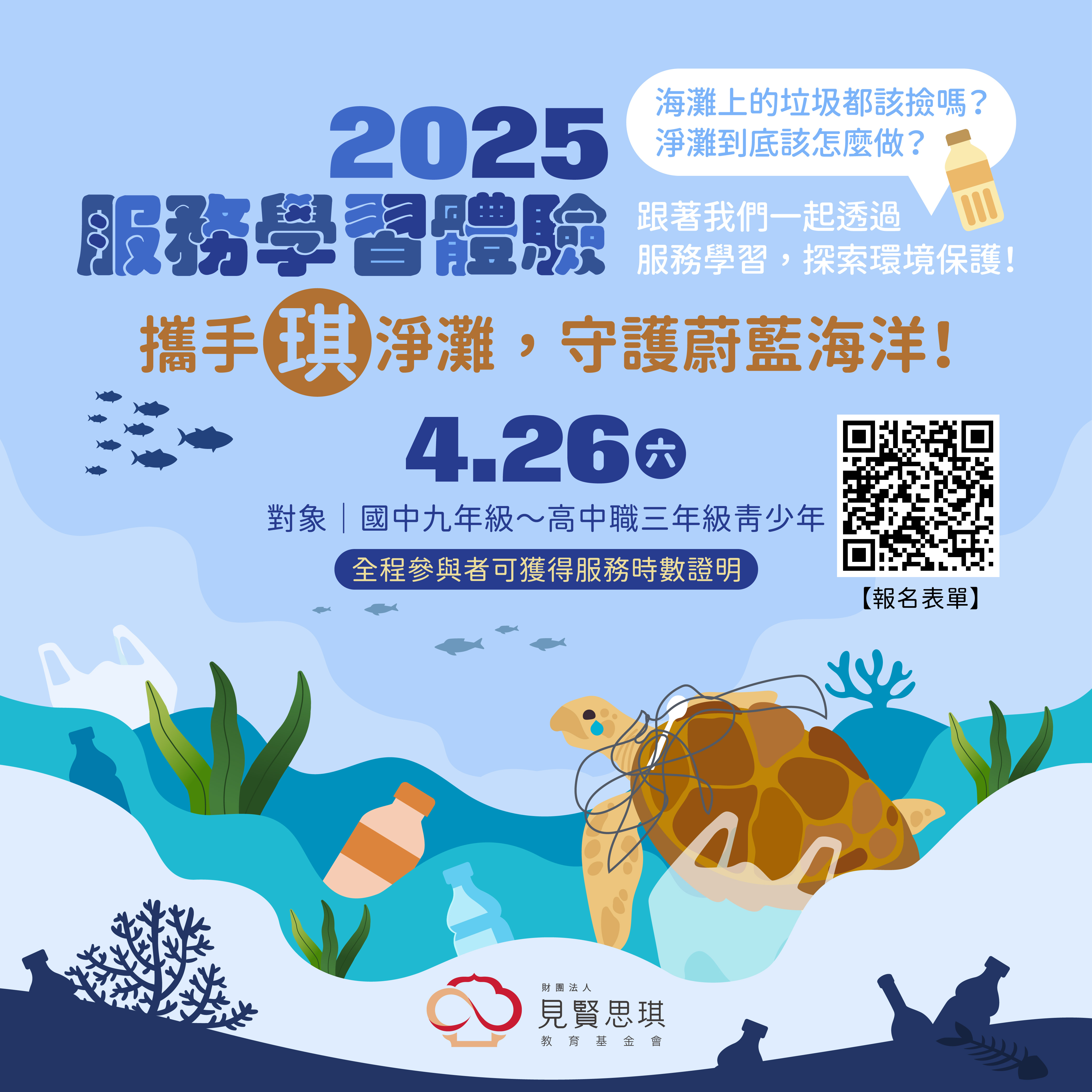 一、見賢思琪基金會辦理「2025服務學習-攜手琪淨灘」服務學習活動,透過做中學提供社會參與機會,增進青少年對公共議題的關心,豐富其學習視野,歡迎青少年踴躍參與。