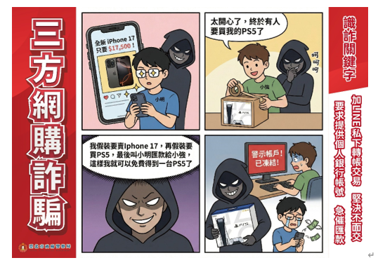 三、近期發現詐騙集團常用「網路購物詐騙」、「三方詐騙」 等方式,誘導民眾匯款或轉帳、淪為警示帳戶,為避免詐 騙集團藉以行騙,爰彙整宣導圖文素材。