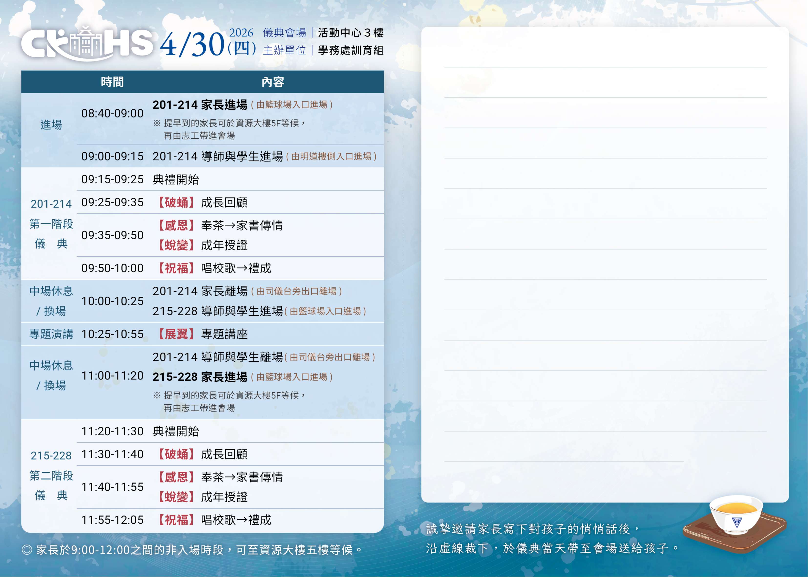 建國中學邀請您參加115年4月30日(四)上午於本校活動中心三樓舉行的「成年禮儀典」。當天的儀式主要包括破蛹、感恩、蛻變、祝福與展翼五大主題。透過成長歷程的回顧,使孩子們省思過去、知恩惜福,接著將安排奉茶儀式感謝師長與家長,實踐感恩、尊重與愛。透過兩代家書傳情,提供家長對孩子成長叮嚀的空間,並鼓勵學生表達對家人的感恩心情。同時由家長授證紀念禮物給所有通過新六藝運動的同學們,最後由高二同學共同合唱校歌,代表對未來的期許。當天邀請到建中校友,透過生涯發展的視野與經驗分享,給學弟勉勵與期許。各班活動流程如下: