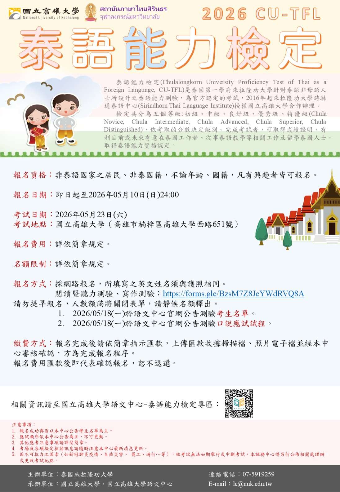 二、旨揭檢定係泰國朱拉隆功大學詩琳通泰語中心授權該校辦理,該檢定為官方認定考試。