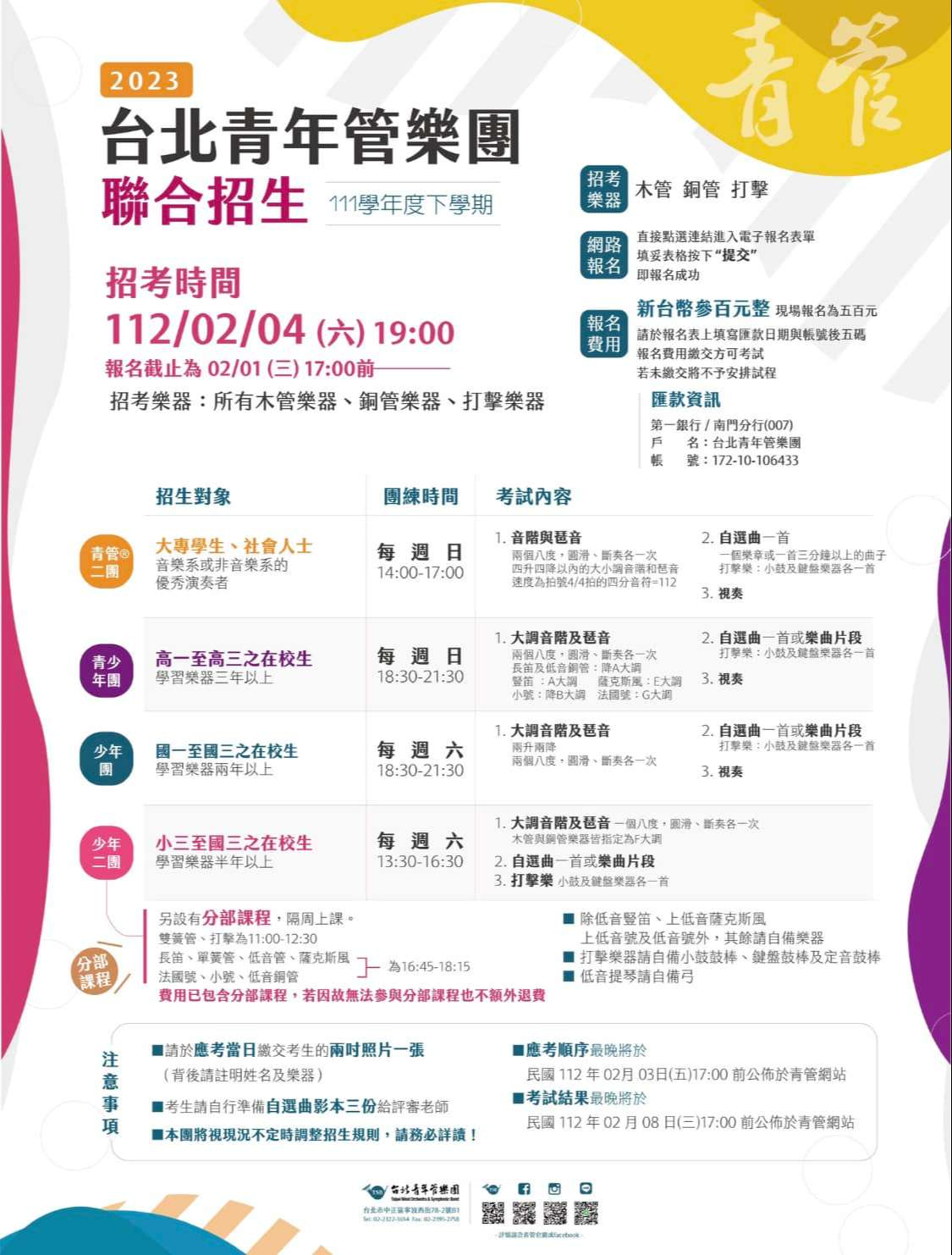 (四)相關招生資訊請至台北青年管樂團臉書粉絲專頁查詢(https://www.facebook.com/tsbgroup/)。