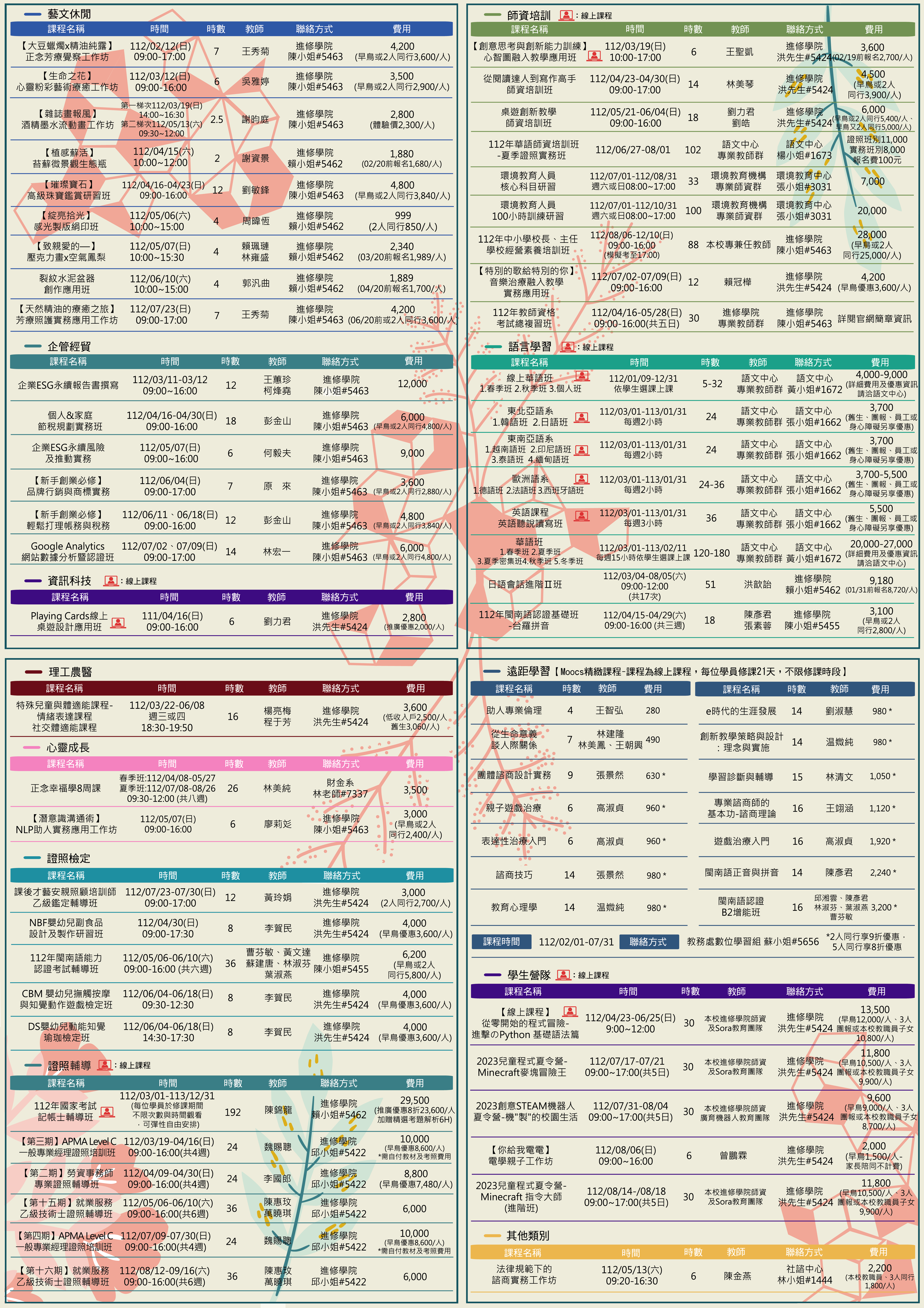 (二)非學分班:類別包含藝文休閒、企管經貿、資訊科技、師資培訓、語言學習、理工農醫、心靈成長、證照檢定、證照輔導、遠距學習(Moocs)、學生營隊與其他類別,課程內容精緻多元,課程設計涵蓋各年齡層,歡迎有興趣者踴躍報名。