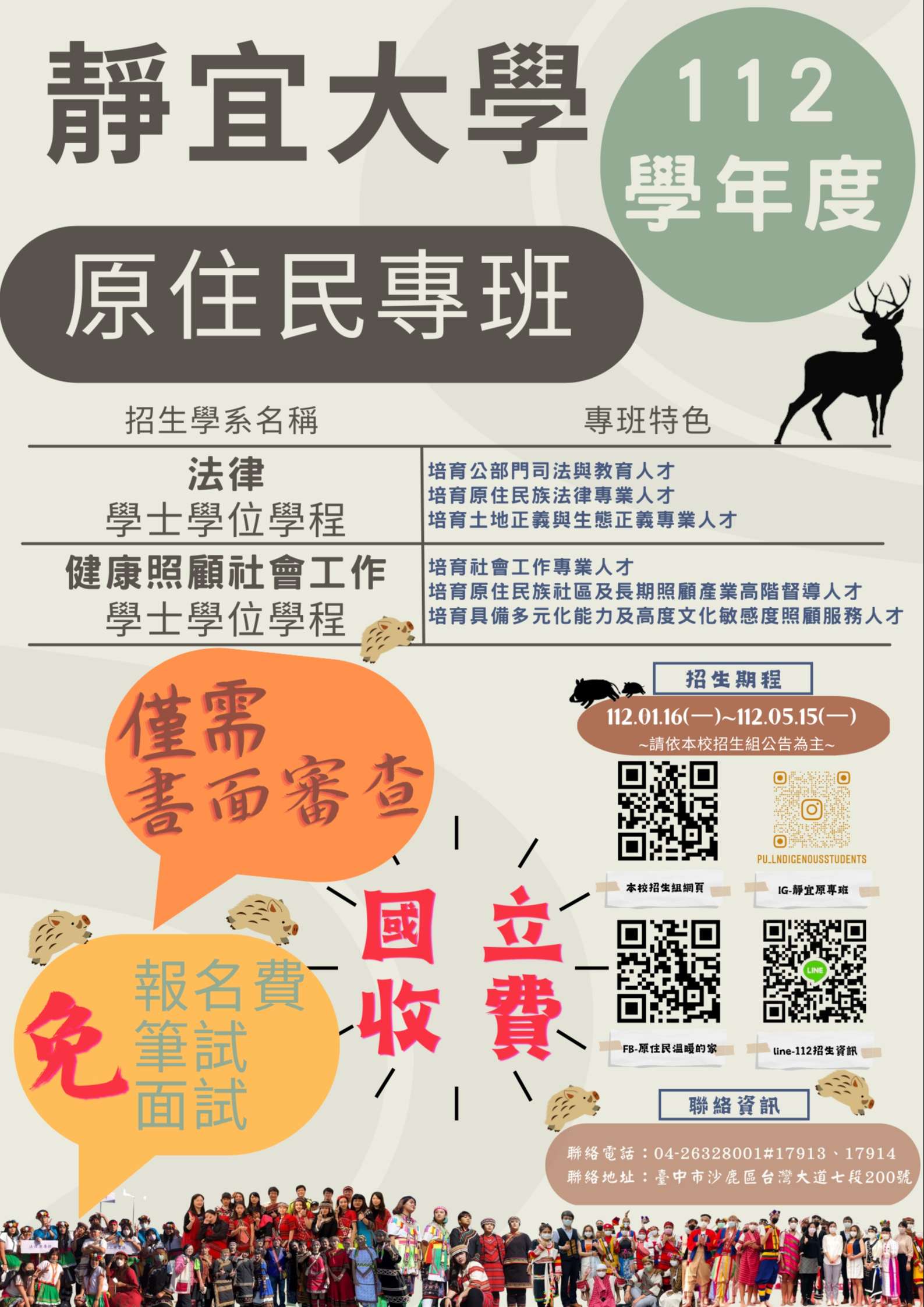 [112升學]轉知「靜宜大學112學年度原住民專班」招生資訊