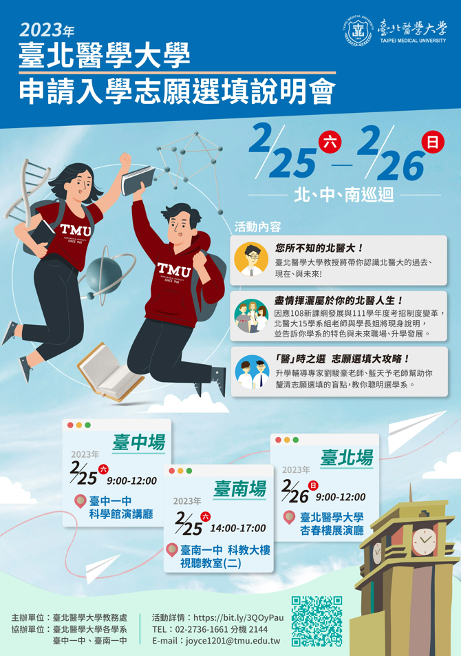 1 .臺北場:112.02.26(日)09:00-12:00,地點:臺北醫學大學杏春摟。