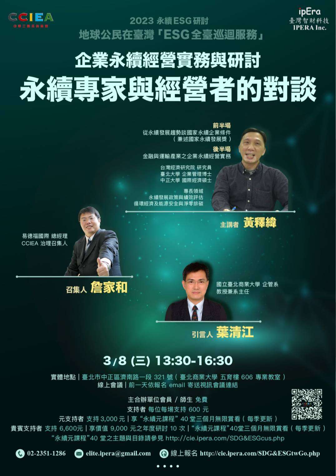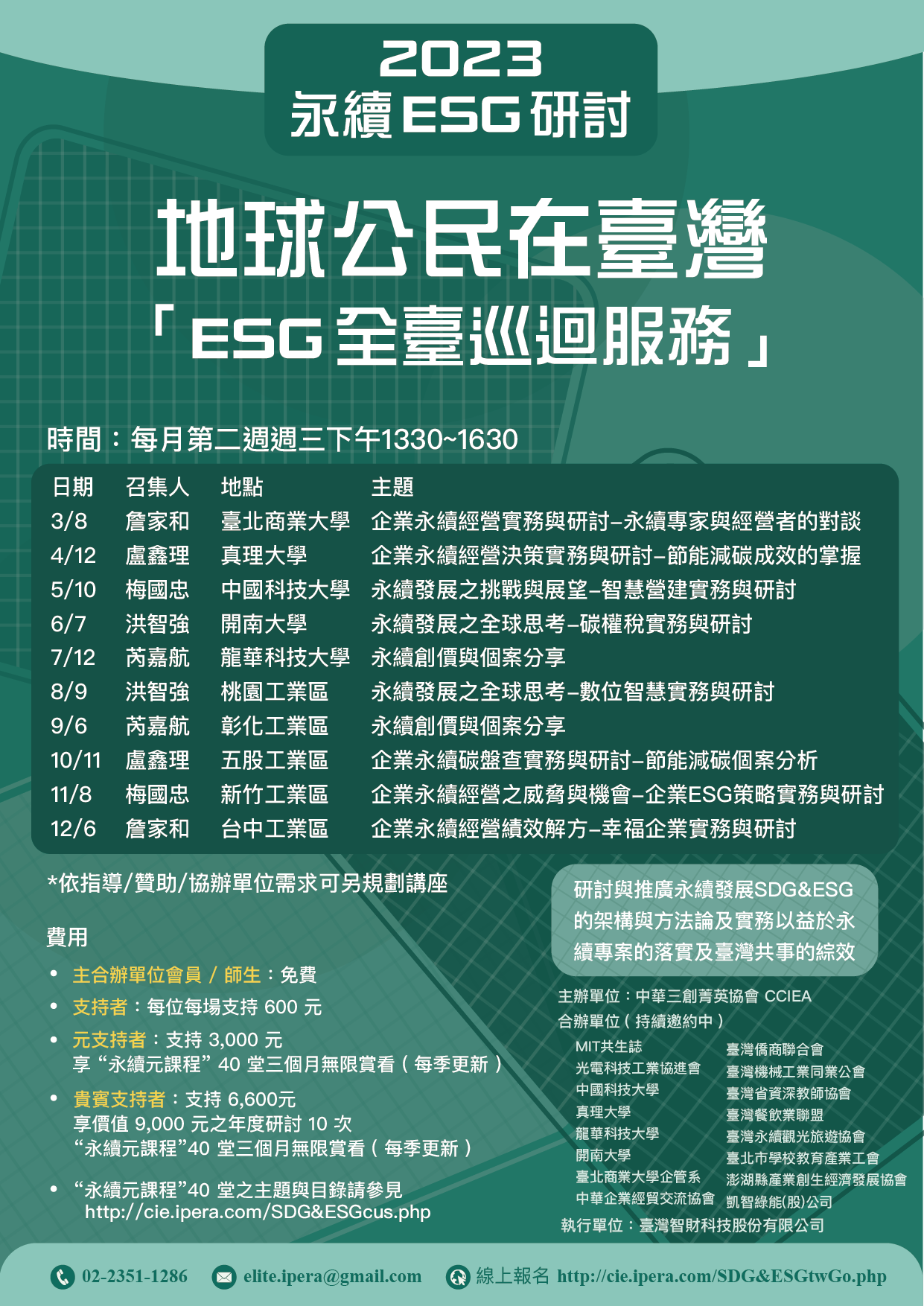 三、【地球公民在台灣】【ESG全臺巡迴服務】系列活動請參閱 下列網址:永續活動1 培育菁英服務地球【認證課程】http://cie.ipera.com/SDG&ESGcus.php、永續活動2 持續精進為淨零【系列活動】http://cie.ipera.com/SDG&ESGact.php、永續活動3 與世界同步永續【永續ESG 研討】http://cie.ipera.com/SDG&ESGtwGo.php。 四、本會會員免費參加,煩請貴校轉知所屬教師。