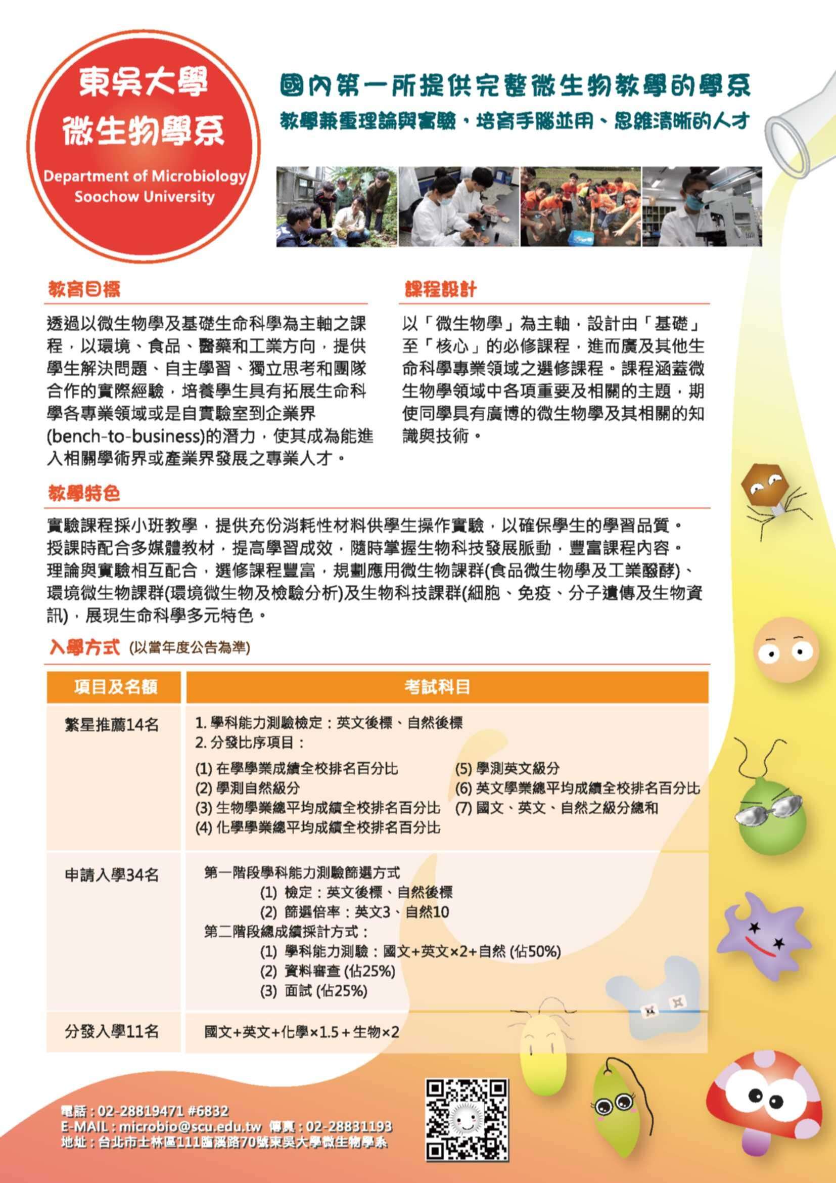 二、正值高中學生選擇大學校系的期間,微生物學系特別規劃多元管道介紹學系資訊,詳細內容請參閱附件。