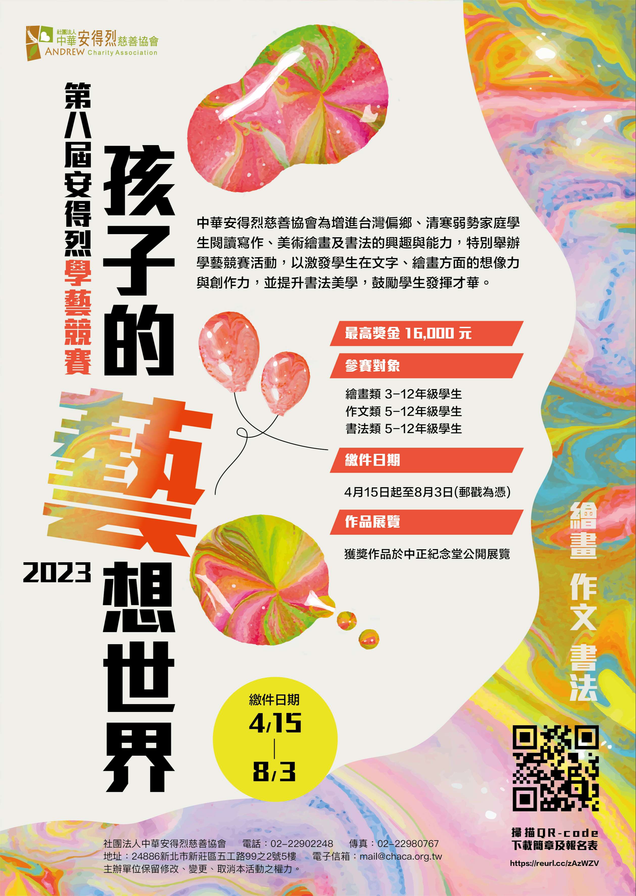 一、本會為增進台灣偏鄉、清寒弱勢家庭學生閱讀寫作、美術 繪畫及書法的興趣與能力,特別舉辦學藝競賽活動,以激 發學生在文字、繪畫方面的想像力與創作力,並提升書法 美學,鼓勵學生發揮才華。 二、今(112)年為本協會辦理之第八屆學藝競賽,比賽類別及年 齡分組概述如下:
