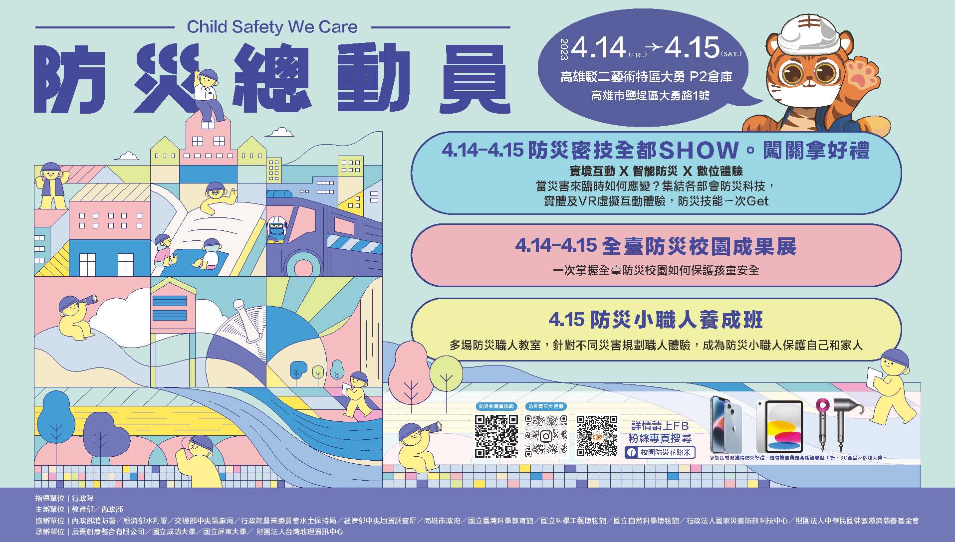 一、旨揭活動(資訊如附件)辦理方式,係以攤位展覽規劃,活動採以互動、科技、創意、美感、人文與民俗風情等元素融入防災教育,發展出多元化體驗活動、防災遊戲與學習課程,宣傳防災教育,帶領師生、家長及民眾透過體驗及課程互動學習正確的防災知識。
