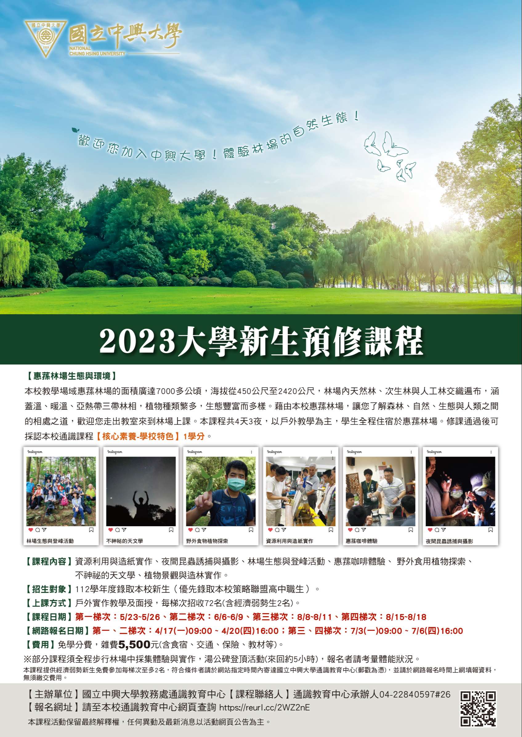 說明: 一、本校通識教育中心開設「惠蓀林場生態與環境」通識課 程,提供112學年度以繁星推薦、個人申請、運動績優等管 道錄取本校之高中應屆畢業生選修,俾充分利用放榜後長 達數月的學習空窗期,使高中與大學教育得以無縫接軌。 二、本課程為大學部通識教育正式課程,修習成績通過者可採 認本校通識課程-核心素養學校特色1學分。預計開設4梯 次共4班,合計招收約288名學生,上課地點為惠蓀林場, 歡迎鼓勵所屬學生報名參加。 三、課程報名等相關資訊請參照網址:https://reurl.cc /2WZ2nE,海報詳如附件。