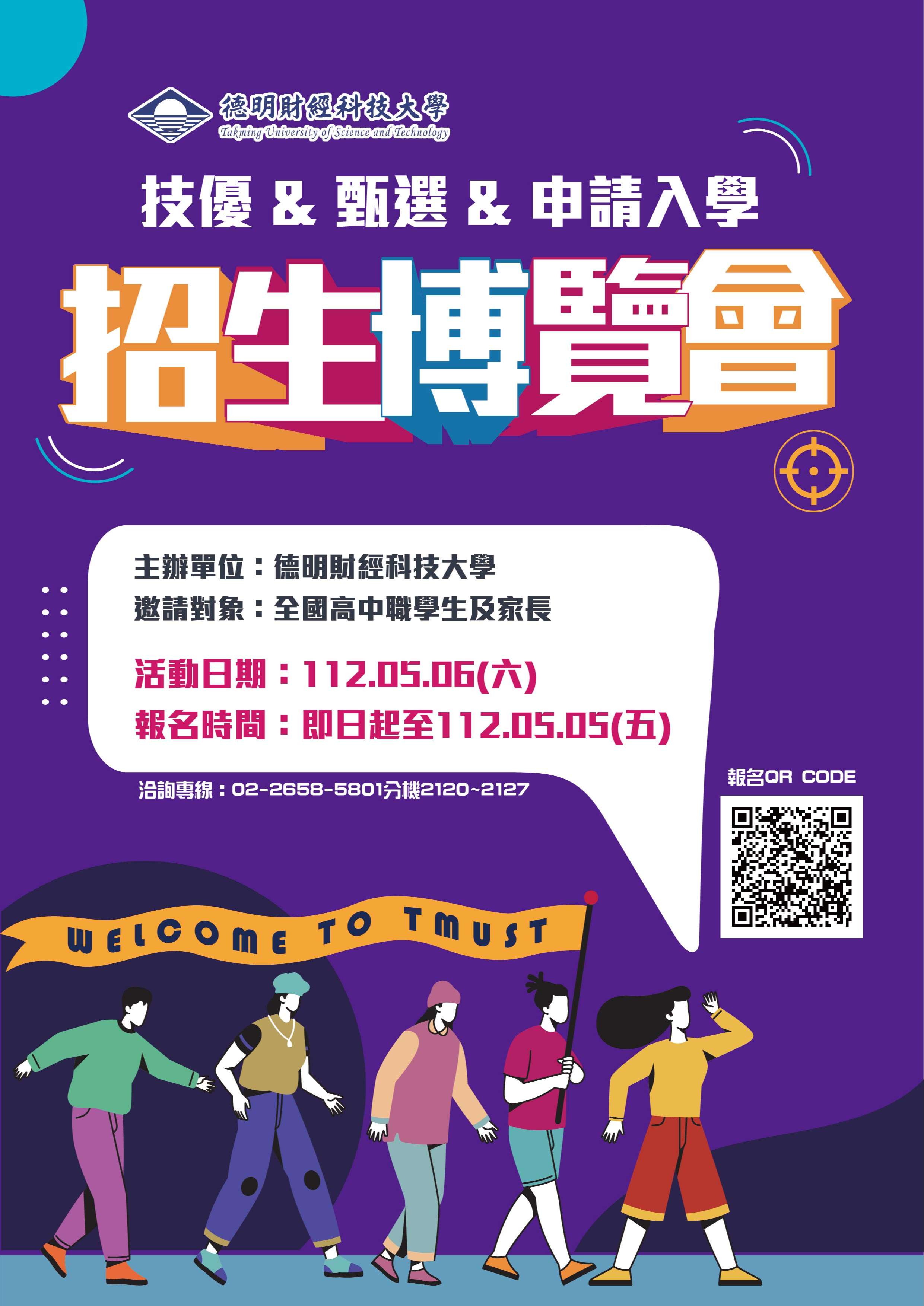 說明: 一、活動目的:為使學生及家長能有機會進一步瞭解校系特 色、教學資源,以及專業設備與卓越成果,進而促進學生 對自身未來發展的適性揚才,特舉辦此活動。 二、主辦單位:德明財經科技大學。 三、邀請對象:全國高中職學生及家長。 四、活動時間:112年5月6日(星期 六)上午場 10時至12時、下午場13時30分至15時30分。 五、報名時間:即日起至112年5月5日(星期五)17:00止。 六、活動地點:本校綜合大樓五樓國際會議廳及各系展區。 七、活動報名:https://reurl.cc/EGgp7m。 八、活動費用:完全免費,現場敬備精美餐盒。九、本次開放線上參與,亦可於當天活動時間關注「德明財經 科大Youtube」一同共襄盛舉。
