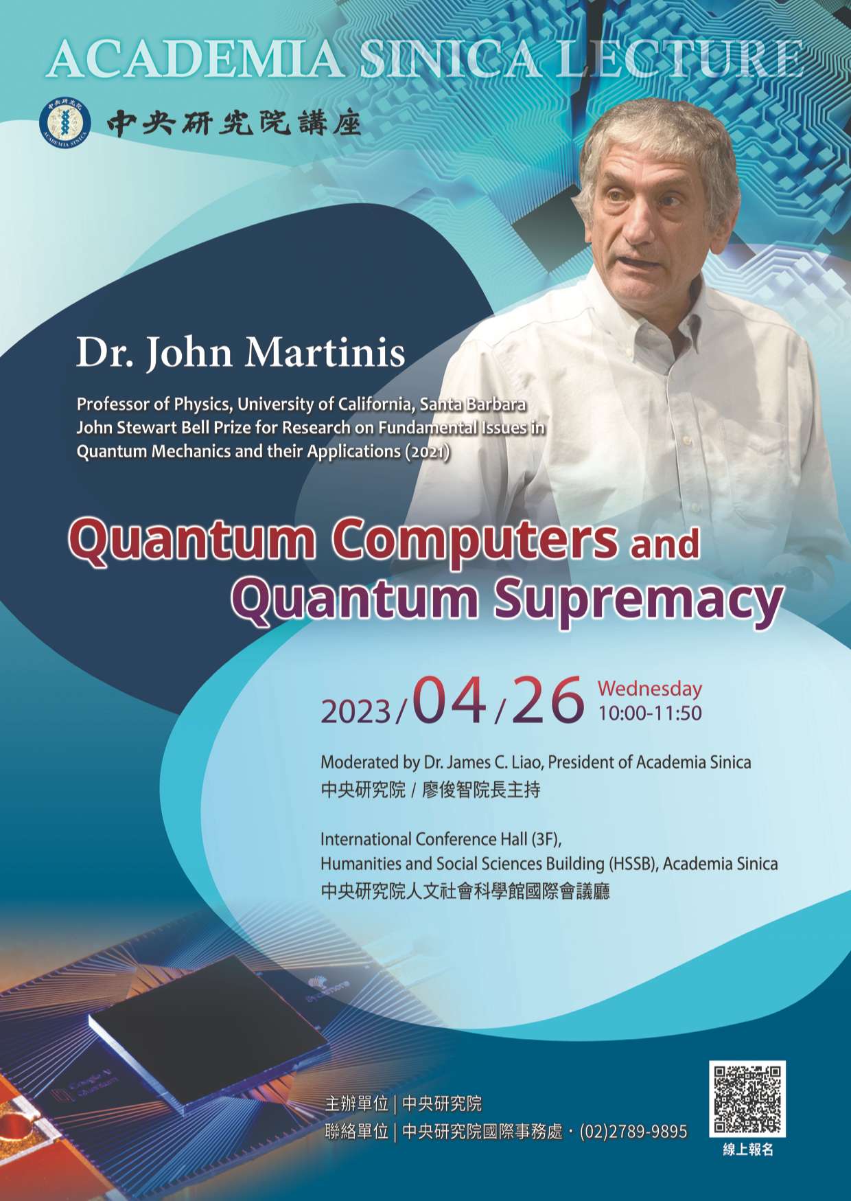 中央研究院邀請國際知名量子物理學家約翰.馬汀尼斯博士 (Dr. John Martinis)擔任2023年度「中央研究院講座」 講者發表專題演講「量子電腦與量子霸權」,歡迎報名參加,詳細資訊請見附件檔案,謝謝~