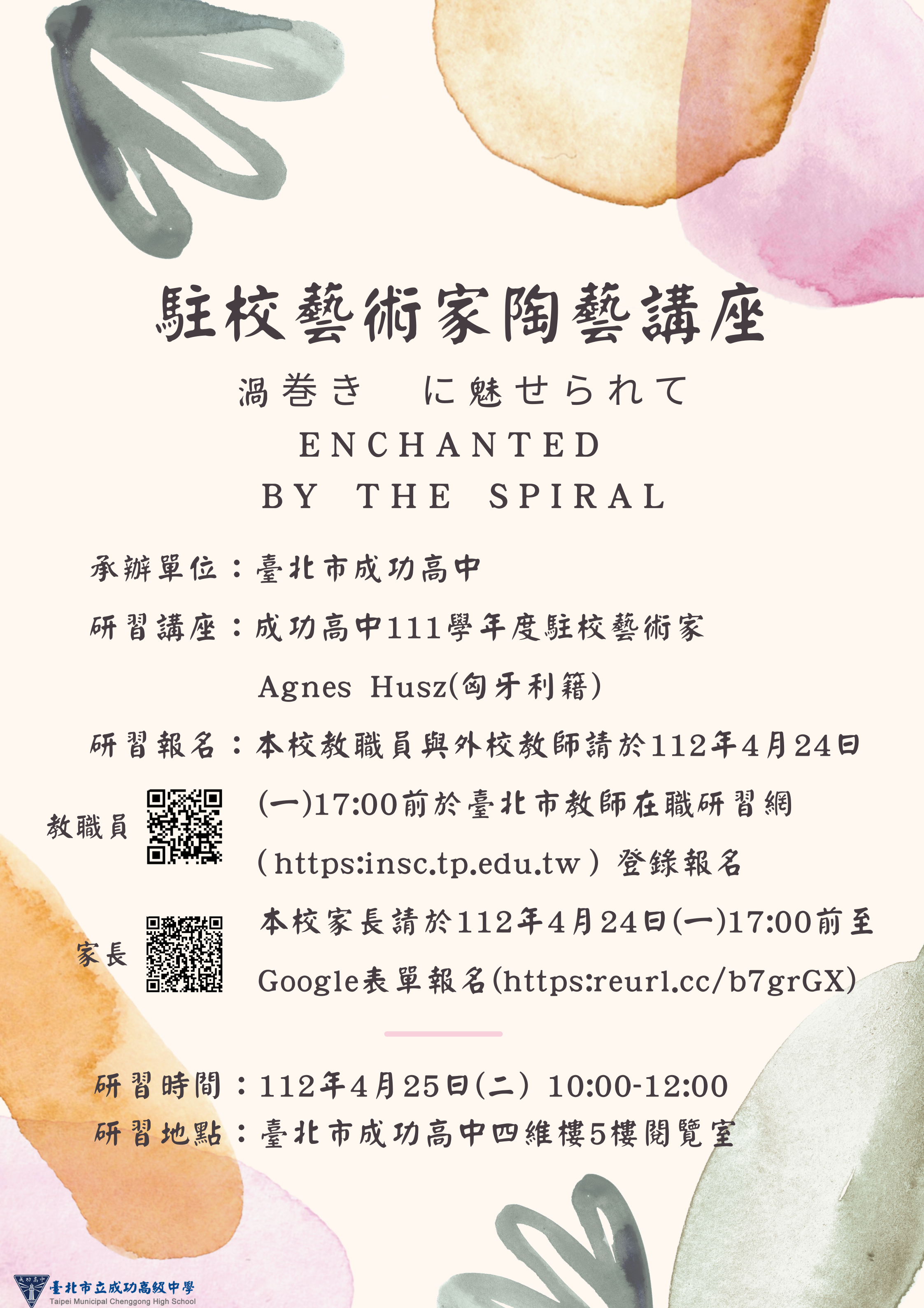 臺北市立成功高級中學辦理111學年度校慶系列活動—駐校藝術家陶藝講座, 歡迎報名參加,詳細資訊請見附件檔案,謝謝~