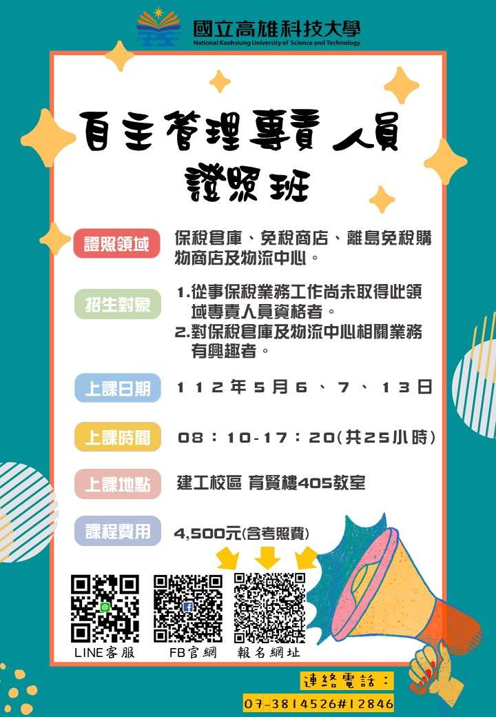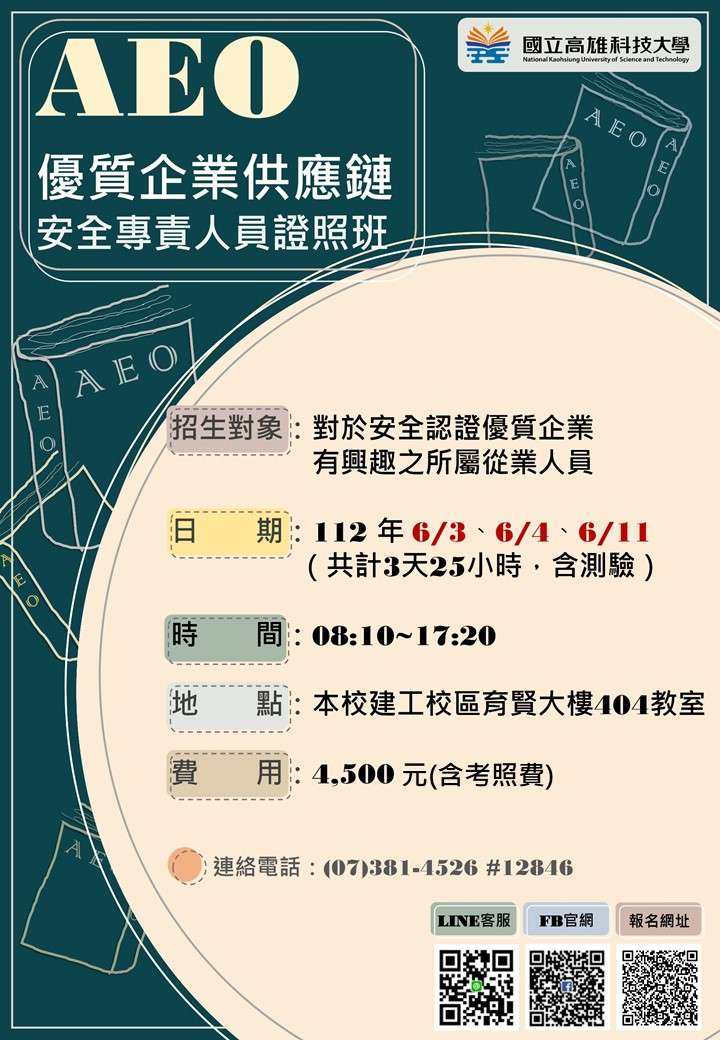 高雄科大推廣教育「優質企業(AEO)供應鏈安全專責人員 證照班」及,