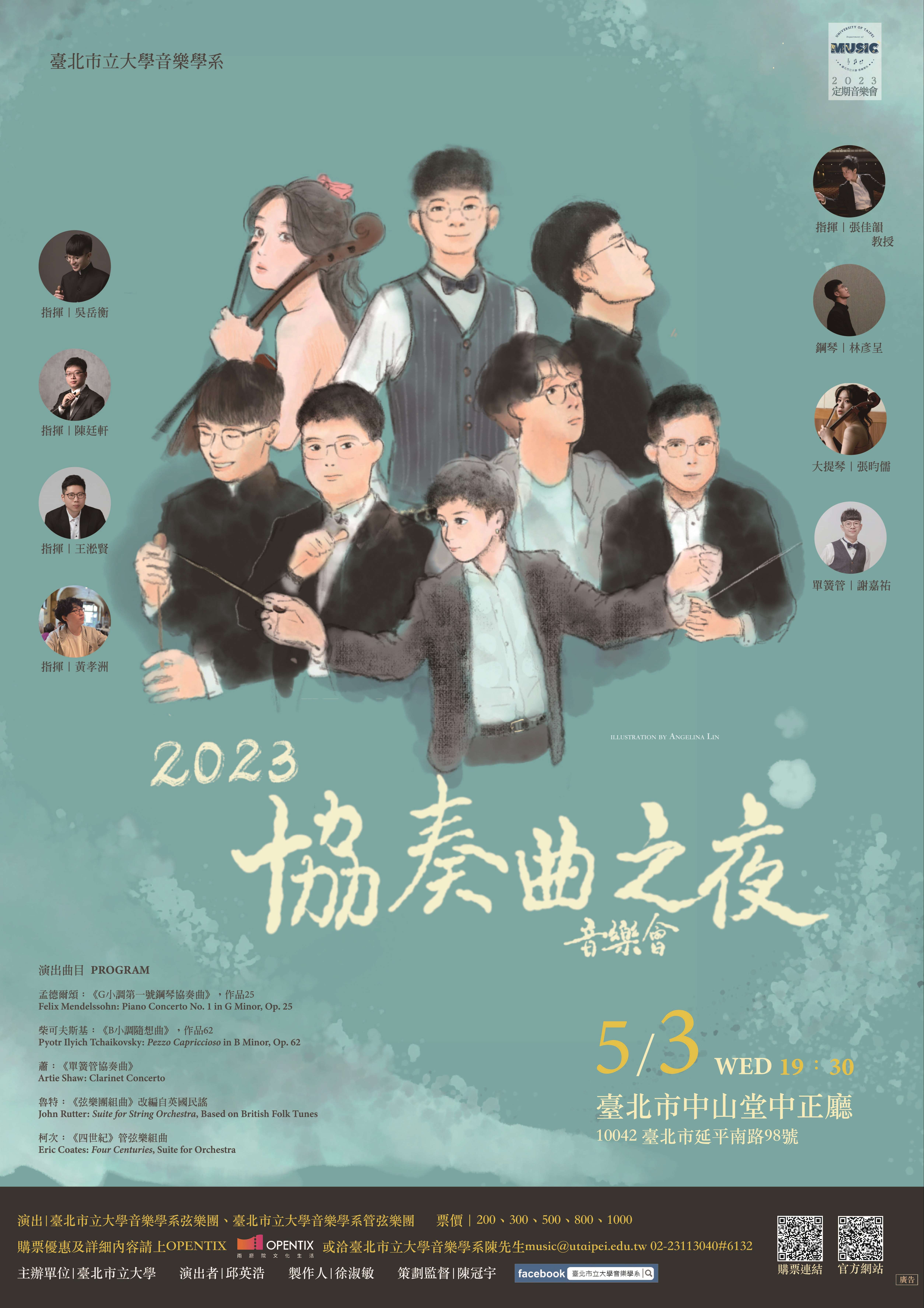 一、為推廣音樂並展現教學成果,本校音樂學系訂於112年5月3 日(星期三)19時30分假臺北市中山堂中正廳舉辦「2023 臺北市立大學協奏曲之夜音樂會」,音樂會由指揮張佳韻 教授帶領,由本系碩士班指揮組學生、111學年度協奏曲比 賽決賽前三名得獎者、弦樂團與管弦樂團共同演出。風格 多變且曲曲經典,期盼以本系學生的音樂素養與演奏技 巧,推廣音樂藝術並展現本系全體師生年度教學與學習之 璀璨成果。(海報檔案如附件)