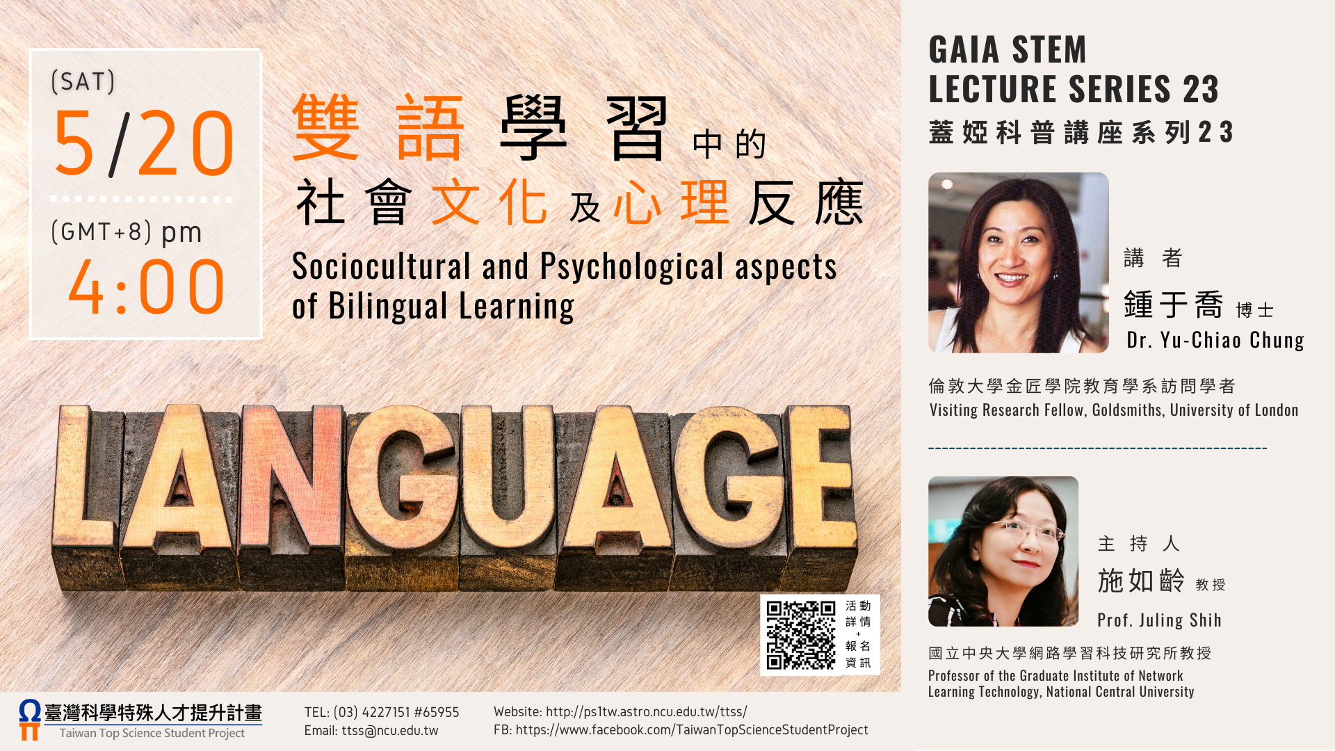 國立中央大學於112年5月20日辦理線上講座:《蓋婭科普講座系 列23》—「雙語學習中的社會文化及心理反應」,請師生踴躍報名參加。