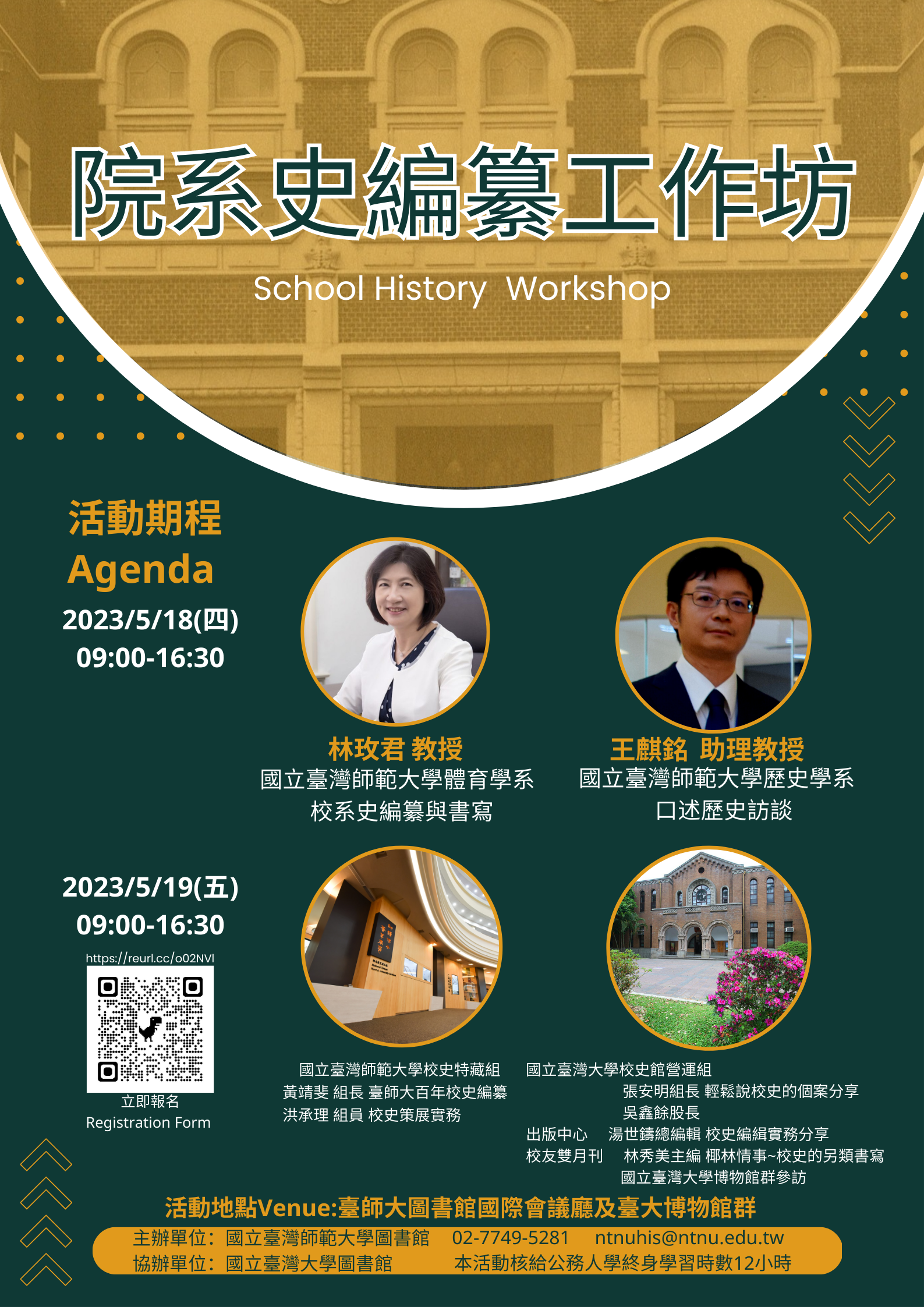國立臺灣師範大學圖書館謹訂於本(112)年5月18日(星期四)、5月19日 (星期五)辦理院系史編纂工作坊,敬請參加。(如附檔)