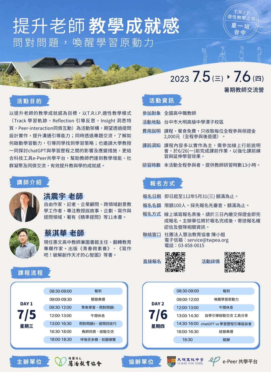 一、本次營隊活動以提升老師的教學成就感為目標,以T.R.I. P.適性教學模式(Track 學習軌跡,Reflection 引導反 思,Insight 洞悉特質,Peer-interaction同儕互動)為 活動架構,期望透過提問設計實作,提升溝通引導能力; 同時透過專題交流,了解如何啟動學習動力,引導同學找 到學習策略; 也邀請大學教授一同探討chatGPT與學習歷程 之間的影響及應變措施,更結合科技工具e-Peer共學平 台,協助教師教學上的增能、促進教師社群凝聚及同儕交 流,有效提升教與學的成就感。