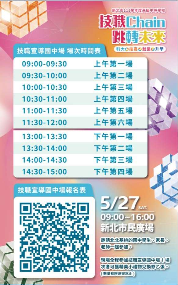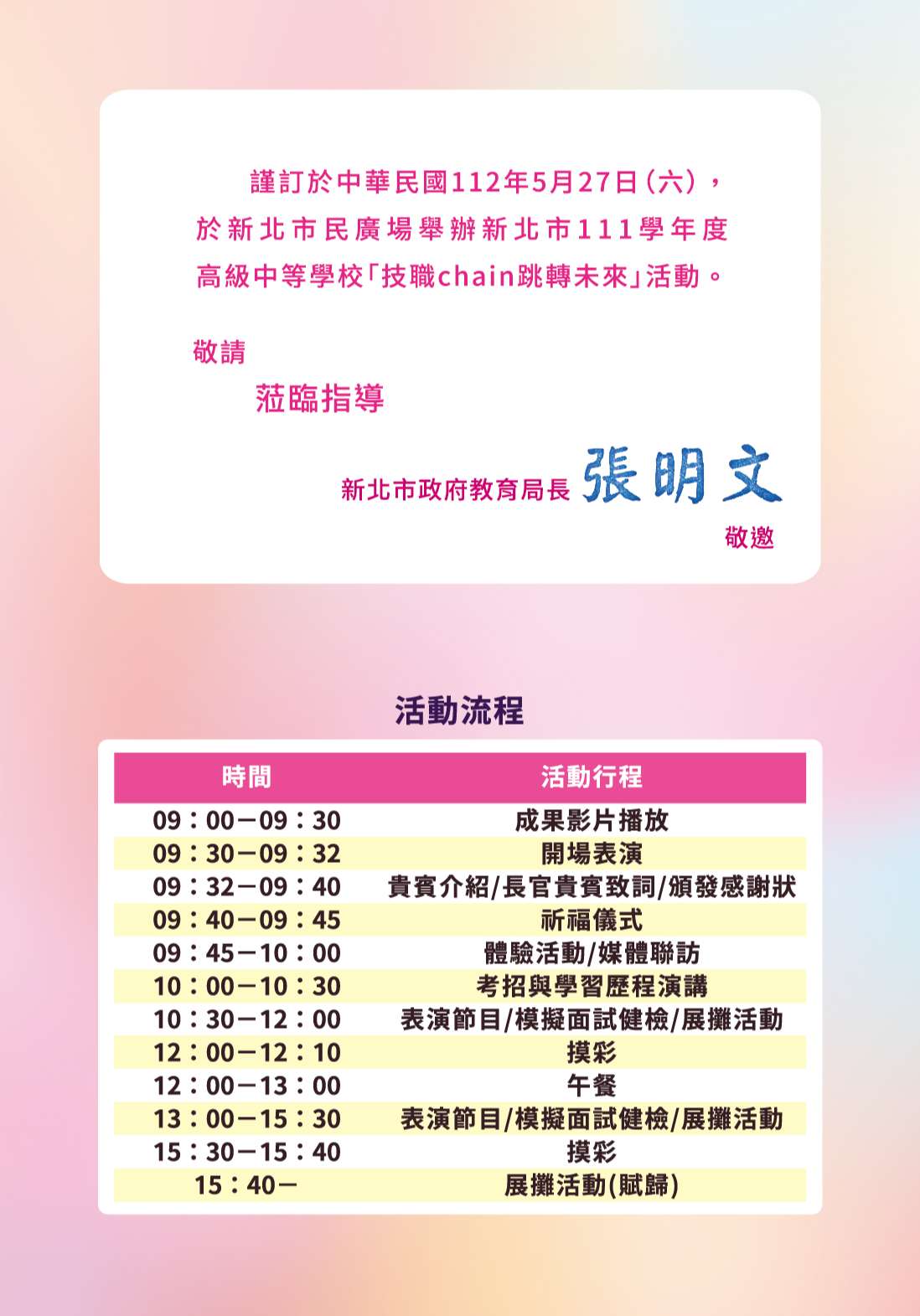 主旨:為提供北北基桃國中學生、高中學生與家長認識技職校院,促進生涯規劃方向,首次與台積電合作辦理新北市111學年度高級中等學校「技職Chain 跳轉未來」升學及就業博覽會,邀集全國國私立科大及產業代表,辦理模擬面試及徵才活動,鼓勵學生、家長與教師參加。