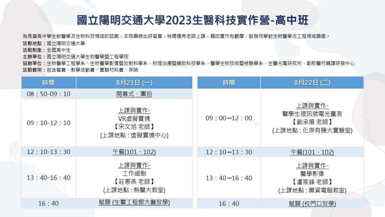 二、活動暑假梯次營期為112年8月21日(週一)至112年8月 22日(週二),共兩日,詳情及報名資訊請上本營隊官方絲團專頁查詢https://www.facebook.com/sbmsecamp/? locale=zh_TW;或電洽本院辦公室:02- 2820-1091。