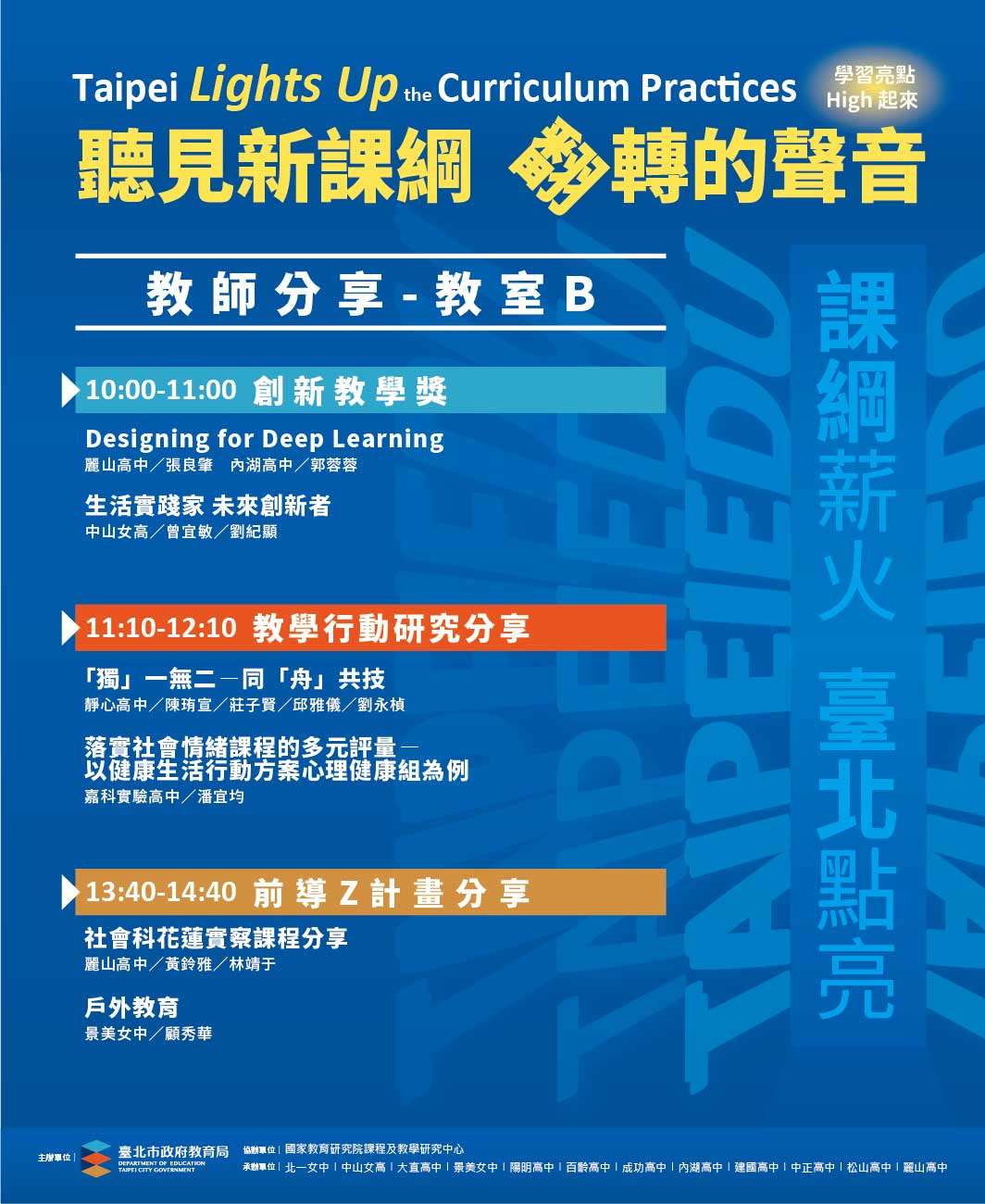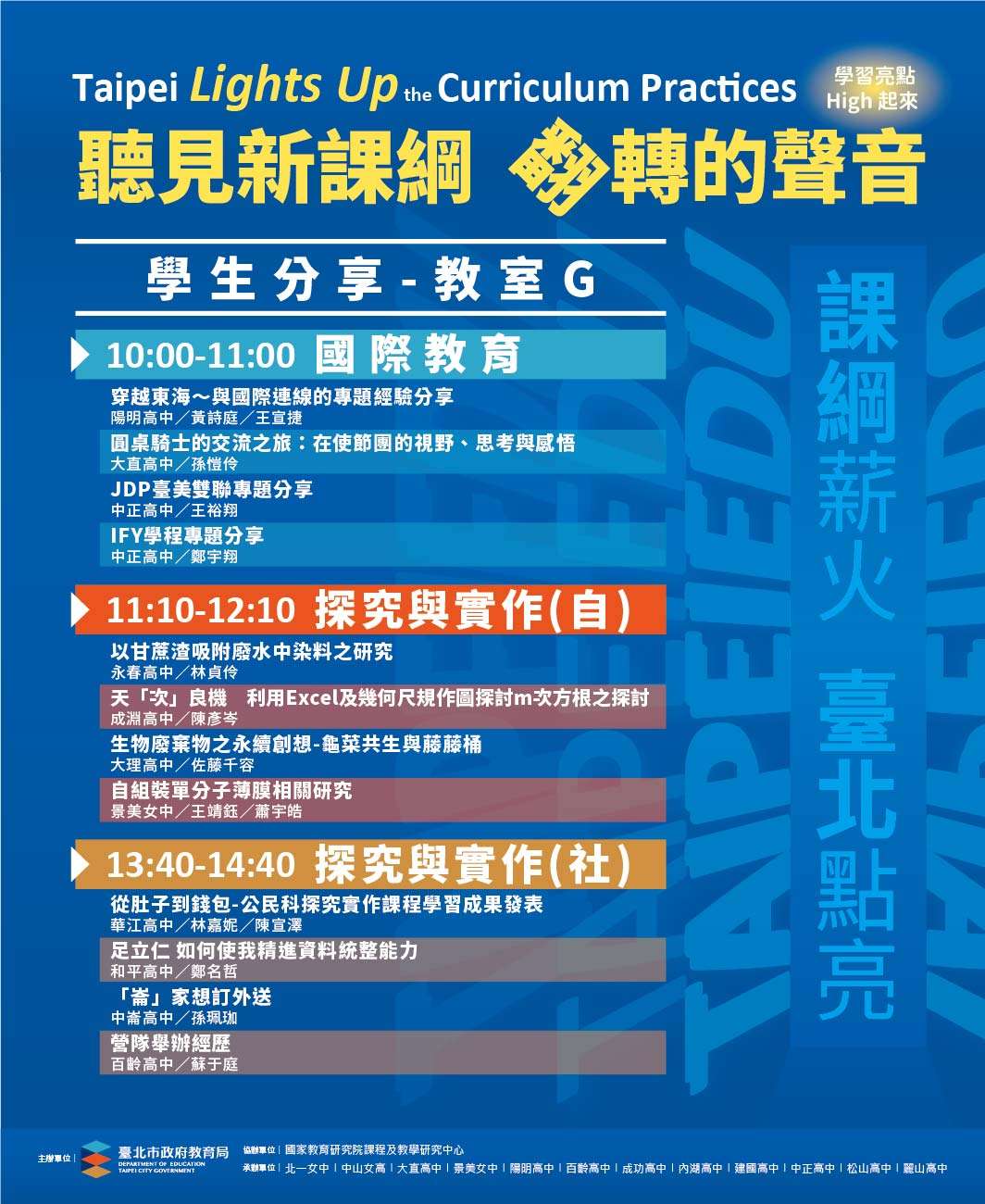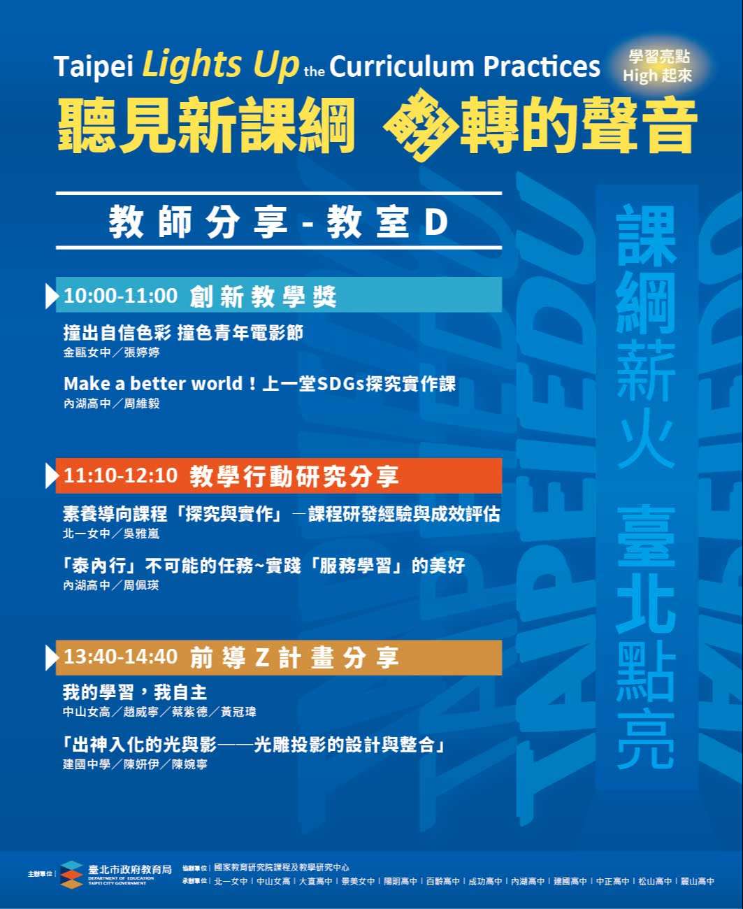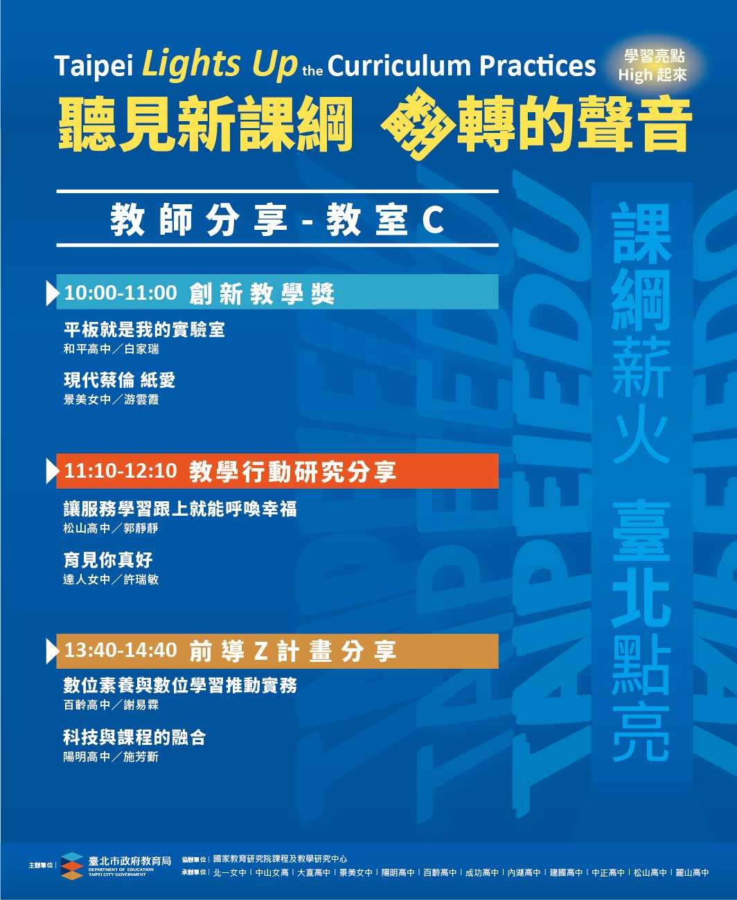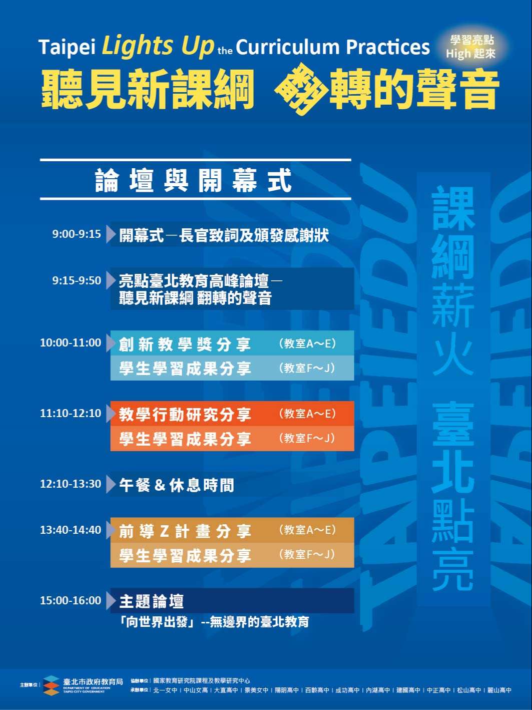 (三)活動內容:30組教師教學經驗分享、60組學生學習歷程 檔案分享及2場主題論壇【亮點臺北教育高峰論壇 聽見 新課綱翻轉的聲音】、【向世界出發 無邊界的臺北教 育】。