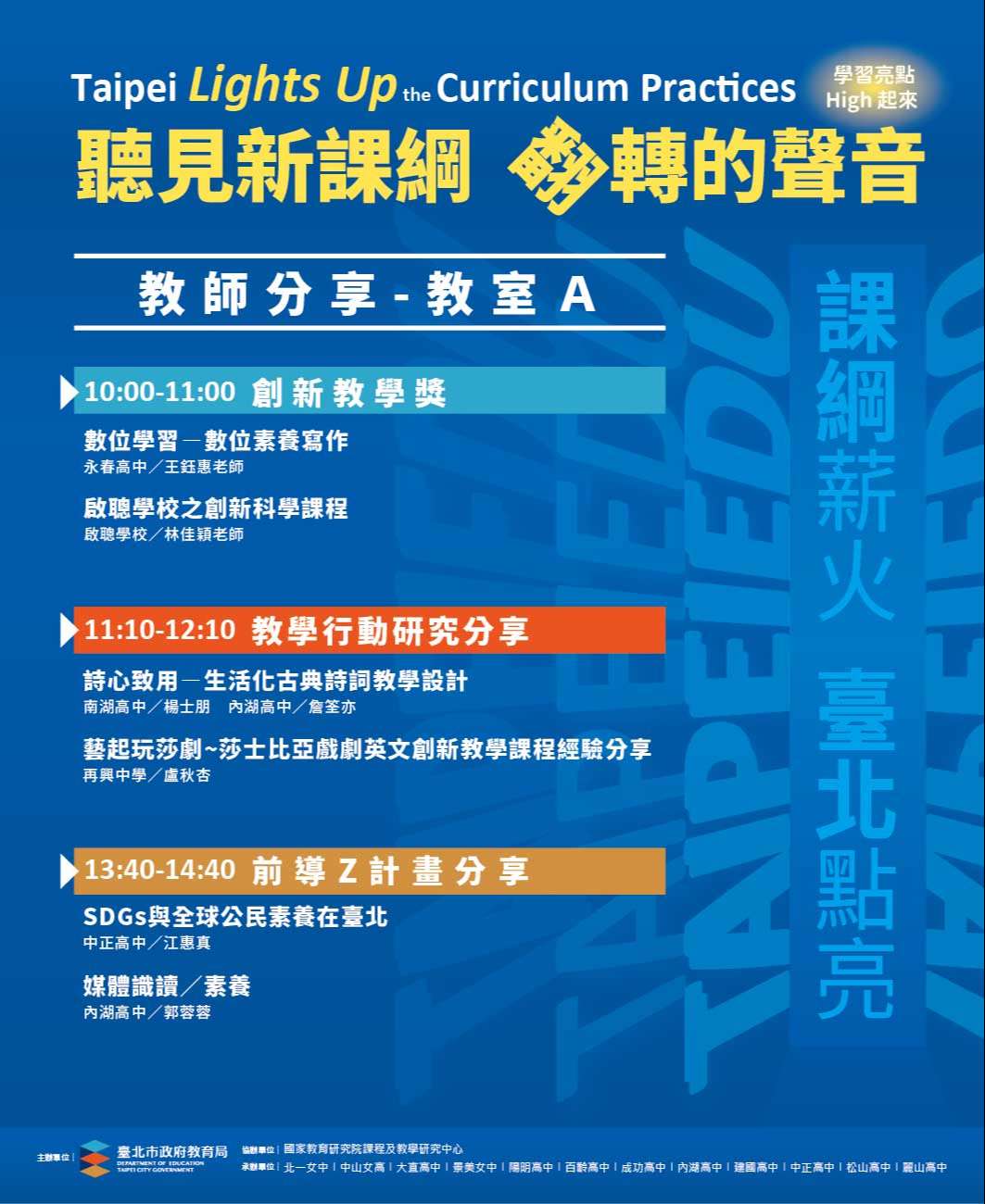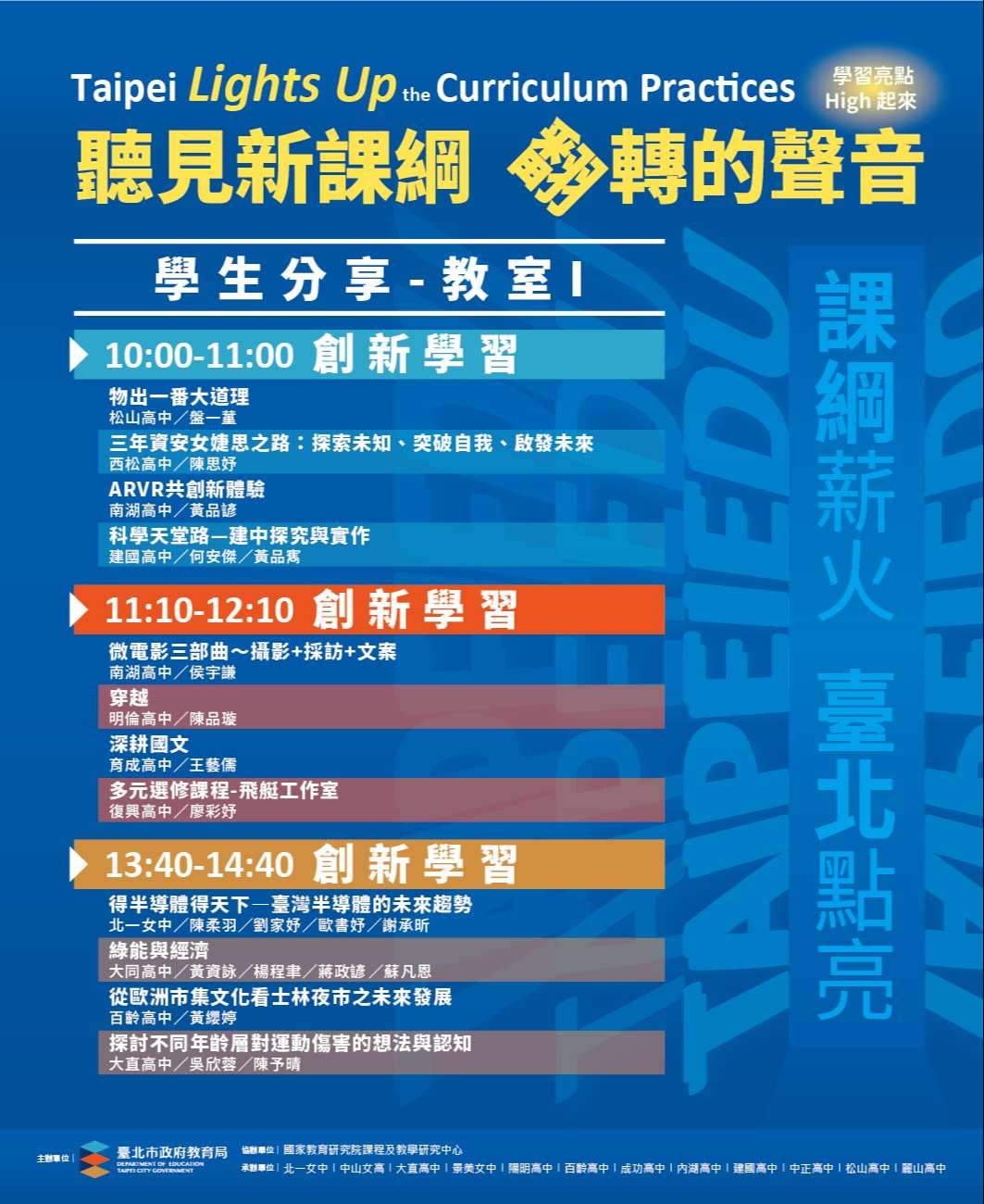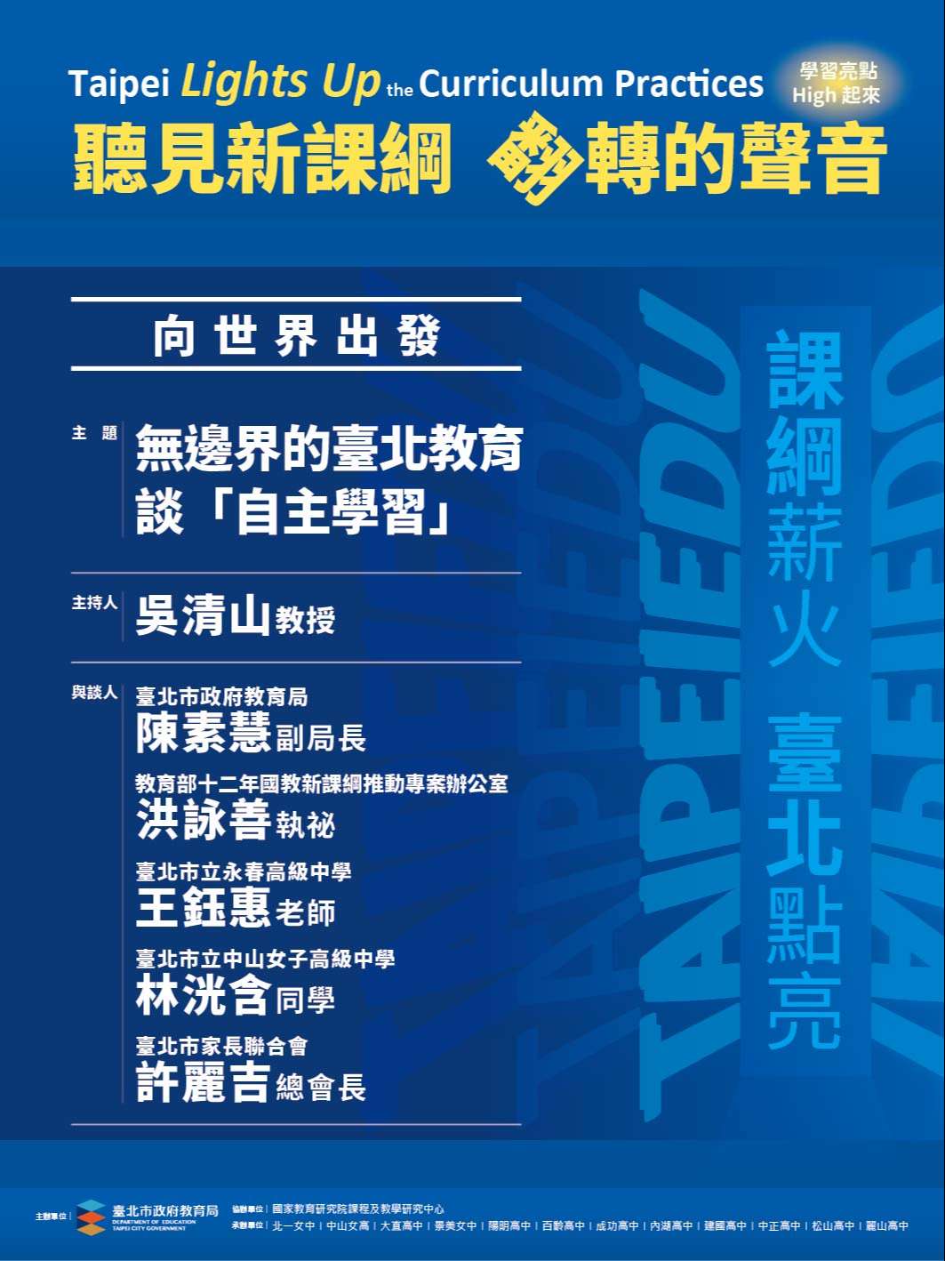 二、旨案112年「課網薪火 臺北點亮」-學習亮點Hih起來系列 活動,教師發表課程教學與學生展現學習歷程成果,並與 大學教授對談,期望透過兩場主題論壇【亮點臺北教育高峰論壇 聽見新課綱翻轉的聲音】、【向世界出發 無邊界 的臺北教育】,專業且深入的對話、研究,激發出更多嶄 新的策略,推動課綱的協作與共好。