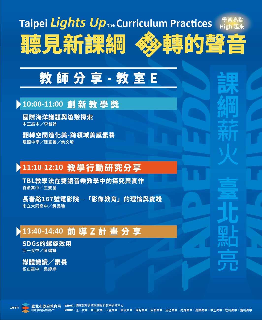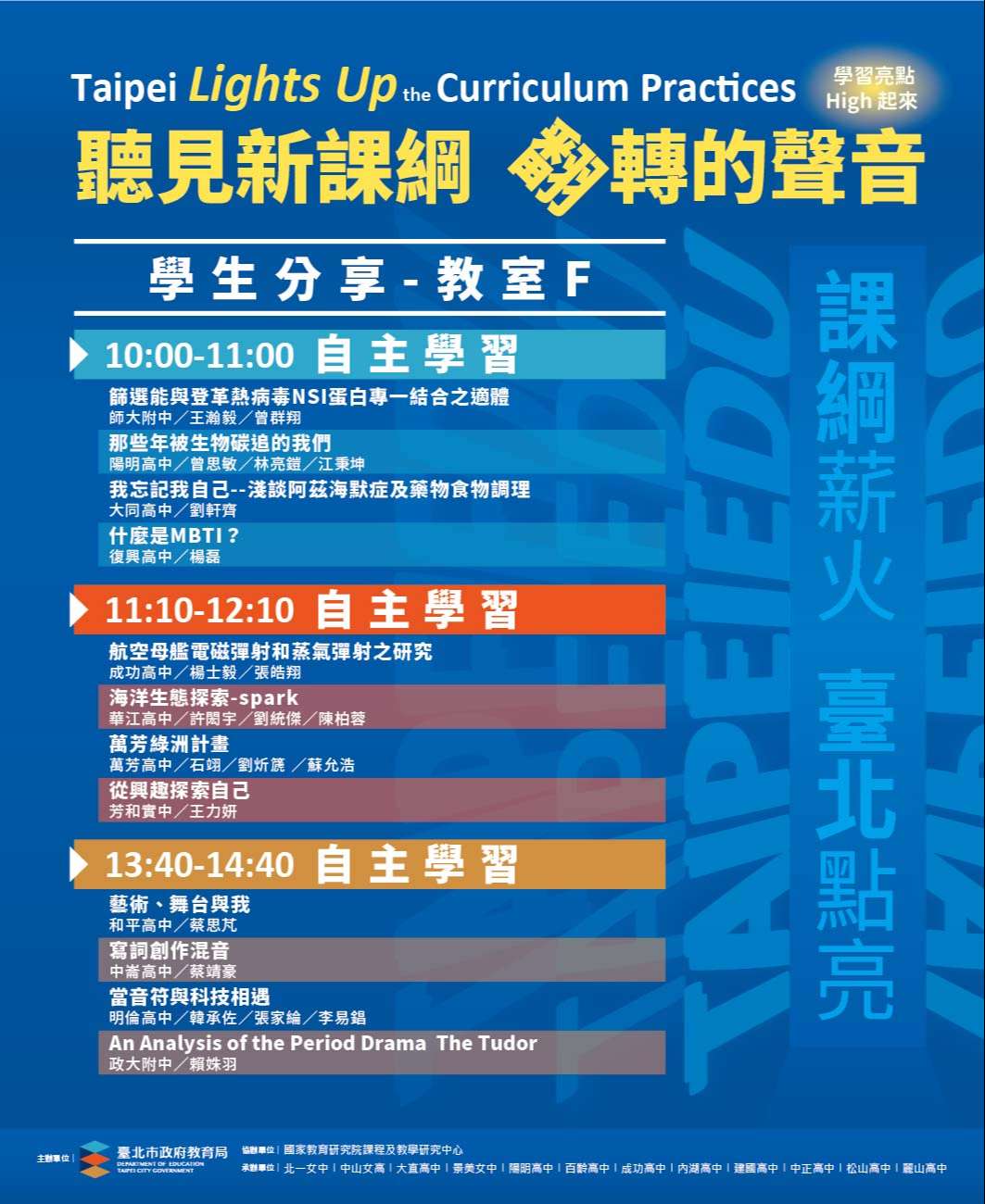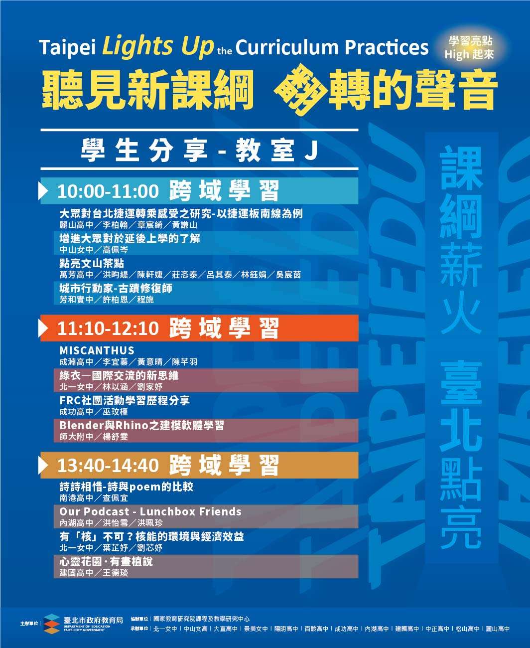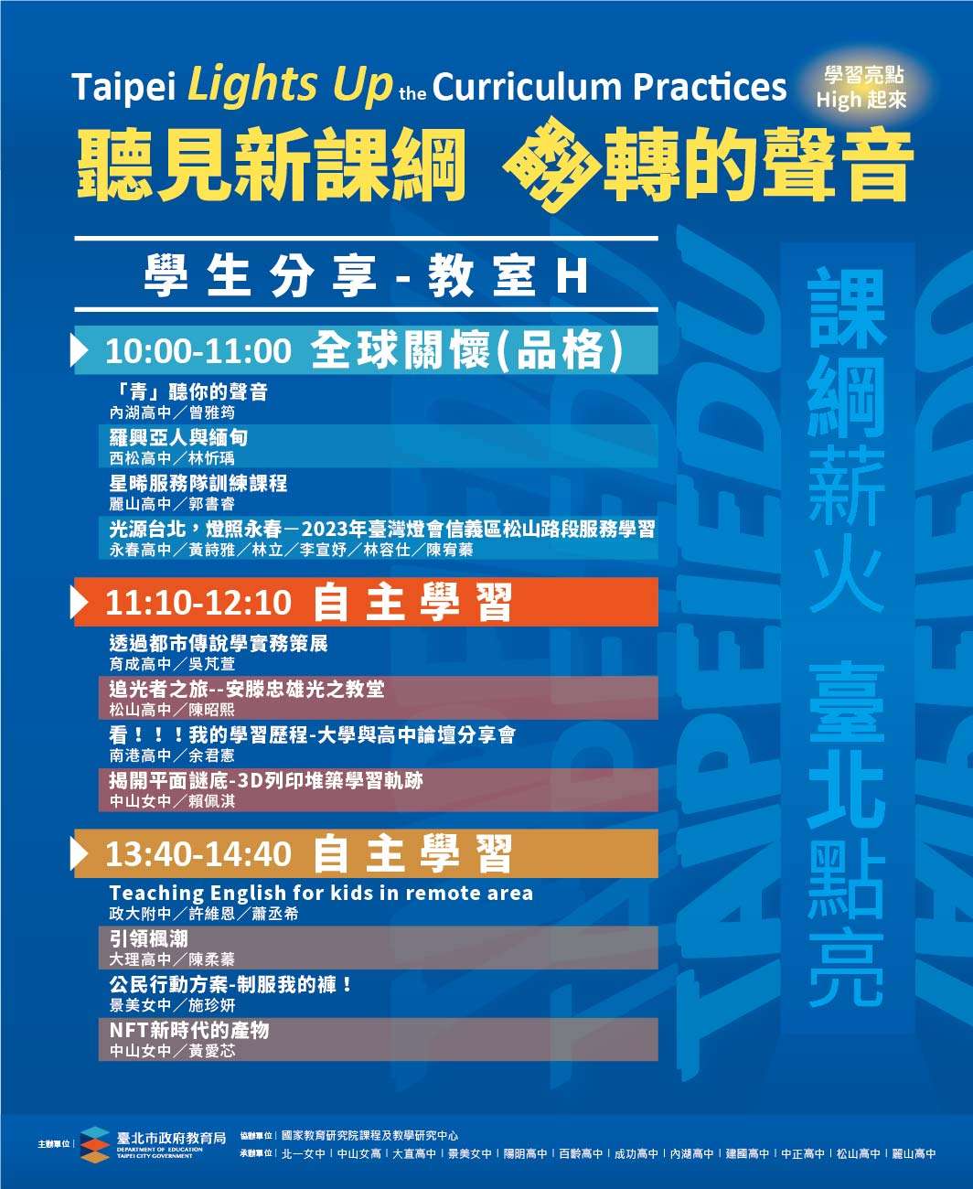 二、旨案112年「課網薪火 臺北點亮」-學習亮點Hih起來系列 活動,教師發表課程教學與學生展現學習歷程成果,並與 大學教授對談,期望透過兩場主題論壇【亮點臺北教育高峰論壇 聽見新課綱翻轉的聲音】、【向世界出發 無邊界 的臺北教育】,專業且深入的對話、研究,激發出更多嶄 新的策略,推動課綱的協作與共好。