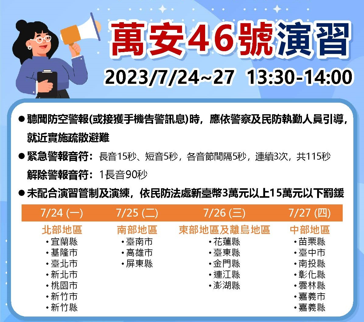 臺北市112年軍民聯合防空(萬安46號)演習訂於7月24日(週一)13時30分至14時實施,