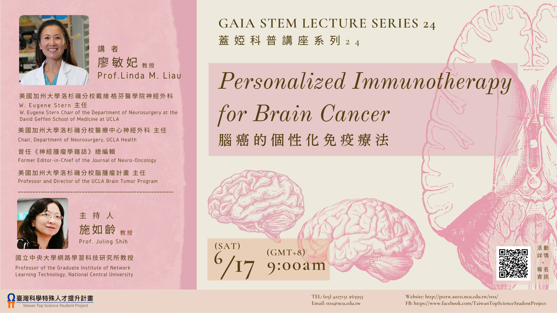 轉知國立中央大學訂於112年6月17日辦理線上講座:《蓋婭科普講座系 列24》—「腦癌的個性化免疫療法」,請師生踴躍報名參加。(如附檔)