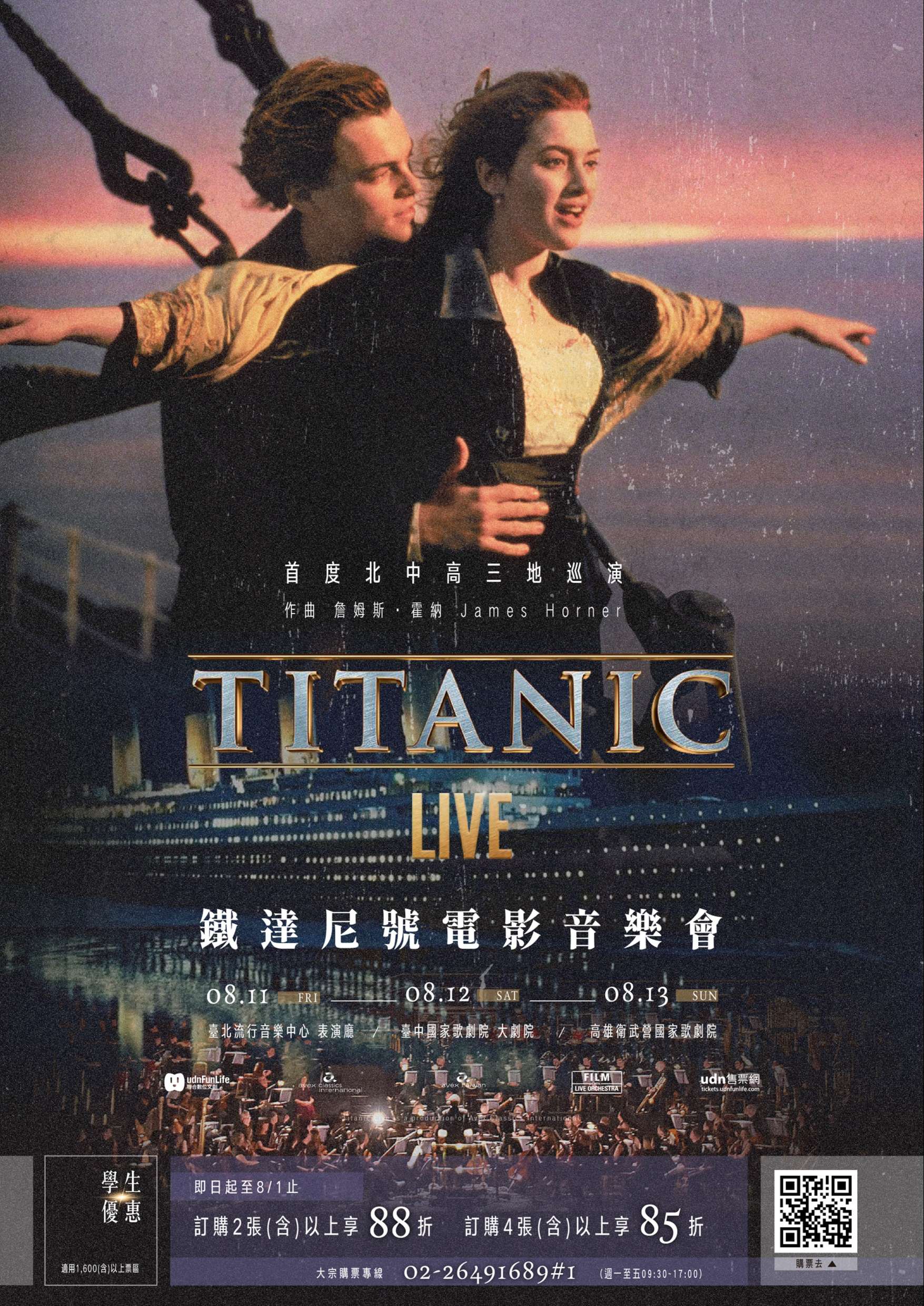 (二)節目介紹:跨越世代的經典電影《鐵達尼號》耗資上億 美元,是當時最昂貴的電影,為了真實還原歷史,導演 詹姆斯.卡麥隆 (James Cameron) 特地打造了1:1的模 型拍攝,同時採用最先進的電腦動畫技術,讓觀眾身歷 其境地參與歷史事件之中。上映總票房就超過18.4億美 元,是全世界首部突破10億美元大關的電影,盤據全球 影史賣座排行榜冠軍長達12年,目前仍高居第3名。《鐵 達尼號》在該年的奧斯卡獎也大放異彩,共獲得14項提 名,最終獲得11座獎項,包括最佳影片、最佳導演、最 佳攝影、最佳視覺效果、最佳原創音樂、最佳原創歌曲 等,同時還創下10項金氏世界紀錄:成本最高電影、票 房最高的劇情片等,在全球影史上的地位難以取代。 《鐵達尼號》配樂由傳奇好萊塢電影作曲家詹姆斯.霍 納James Horner一手打造,除獲得奧斯卡肯定外,亦獲 得3座葛萊美獎,並被認證為史上最暢銷的電影配樂專 輯。由席琳狄翁 (Celine Dion) 演唱的主題曲〈My Heart Will Go On〉更是傳唱大街小巷,是音樂史上最 暢銷單曲之一,在全球超過二十國排行榜登上冠軍。今 年8月將以超過百人的管絃樂團及合唱團編制現場演出,讓觀眾有如身歷其境的感受,當樂音響起時,與傑克和 蘿絲共同出航,體驗這具有歷史意義以及淒美愛情的航 行。演出時間預計215分鐘,含中場休息20分鐘。