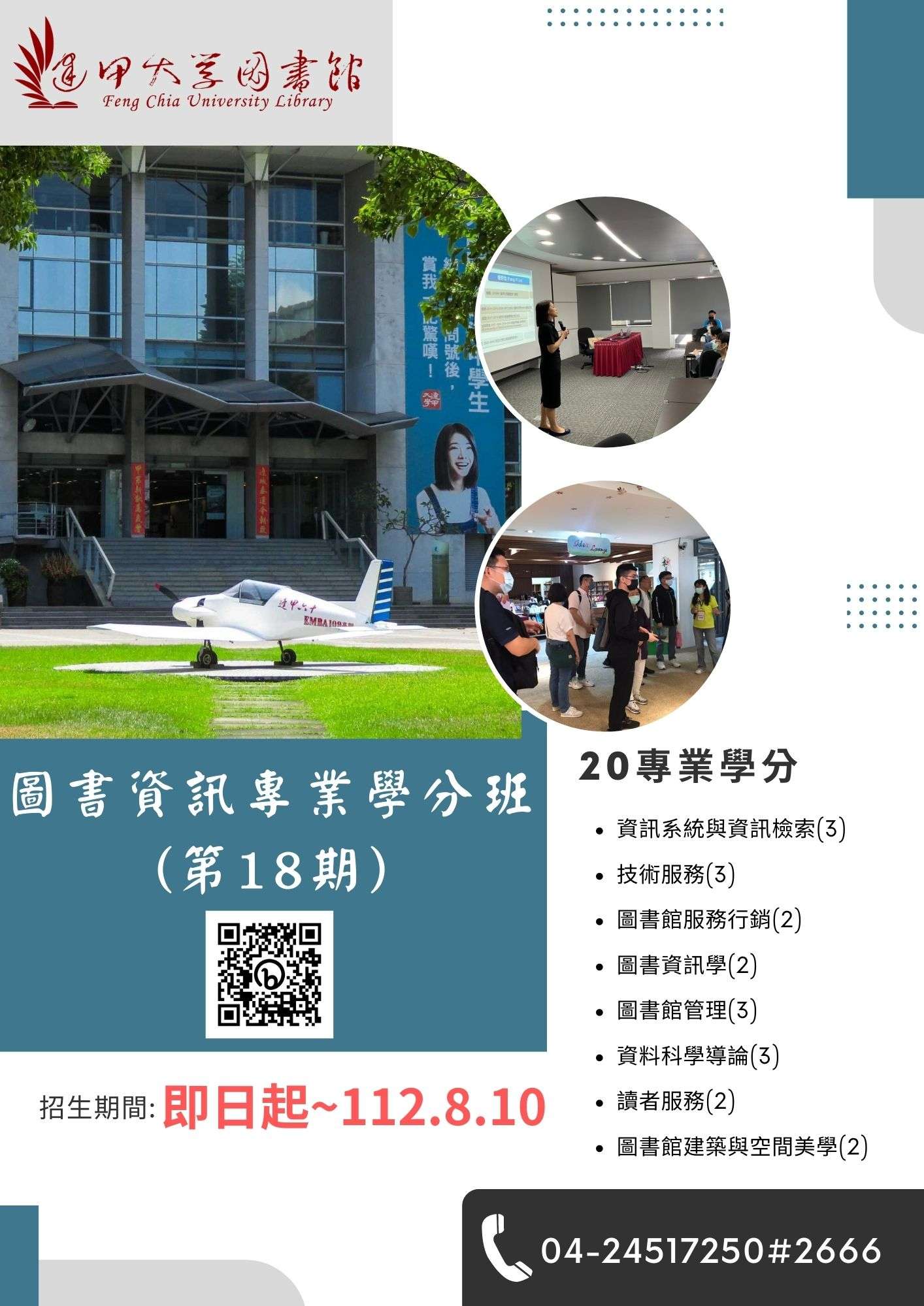 轉知逢甲大學來函辦理圖書資訊專業學分班(第18期),敬請教師及行政人員踴躍參加。(如附檔)