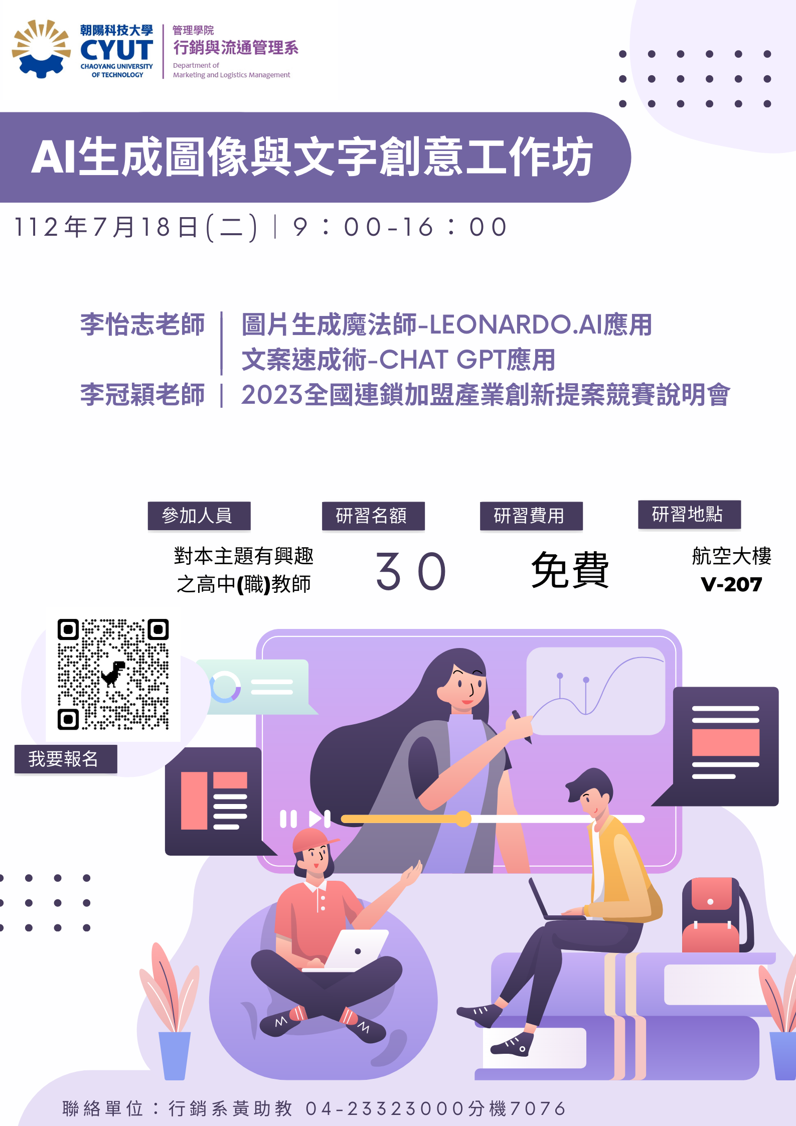 朝陽科技大學行銷與流通管理系112年7月18日(星期二)舉辦「AI生成圖像與文字創意工作坊」,