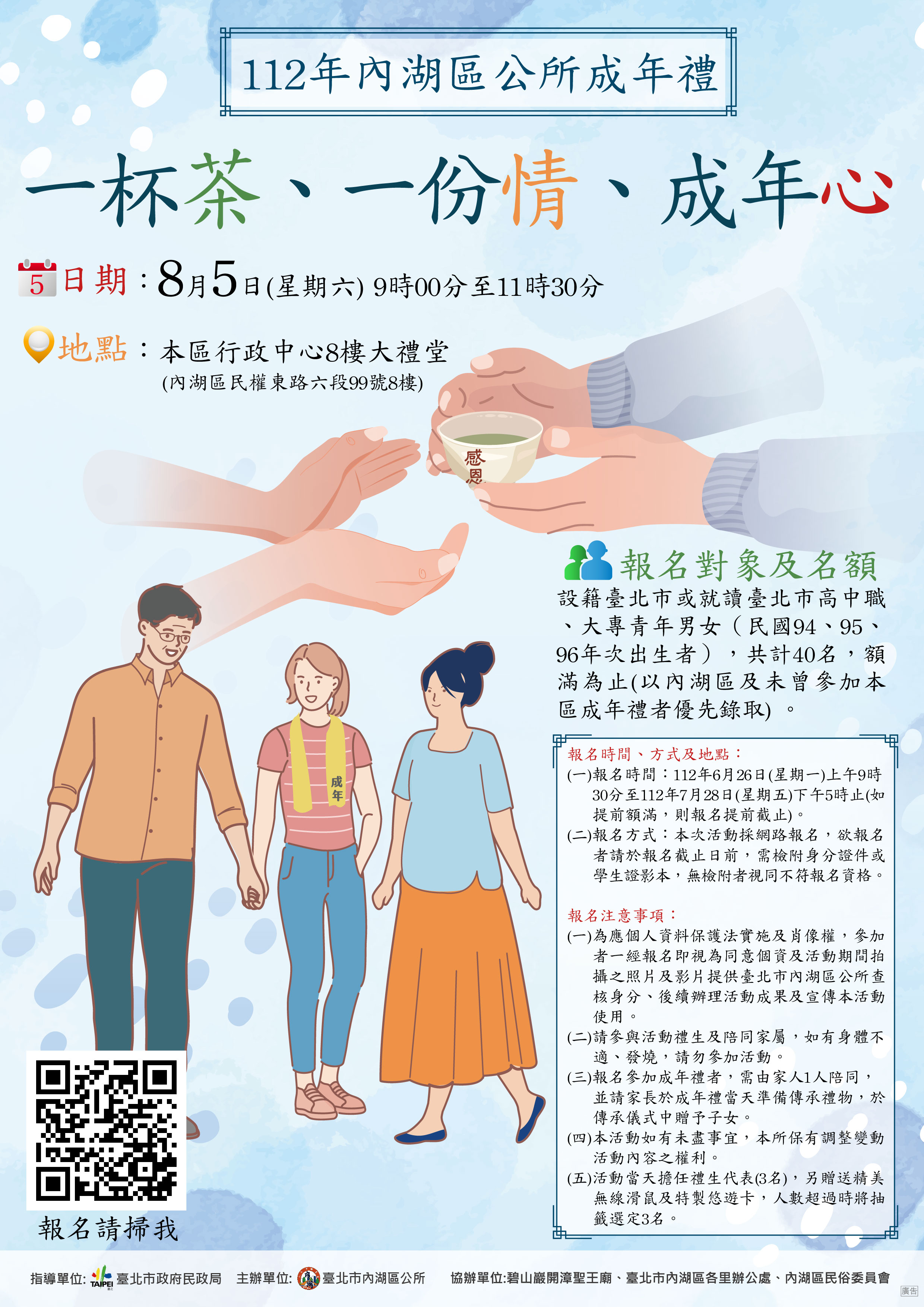 臺北市內湖區公所112年度成年禮活動,訂於8月5日(星期六)上午9時舉辦,凡成功報名並全程參與之禮生,可獲得成年禮紀念郵票、智慧巾、茶具組及禮券600元各1份。活動內容包含茶道文化體驗、穿越智慧門、行感恩禮及成年禮專屬拍貼機,即日起開放報名,歡迎設籍或就讀於臺北市之青年男女(民國94至96年次)踴躍報名參加,內容豐富,精彩可期。