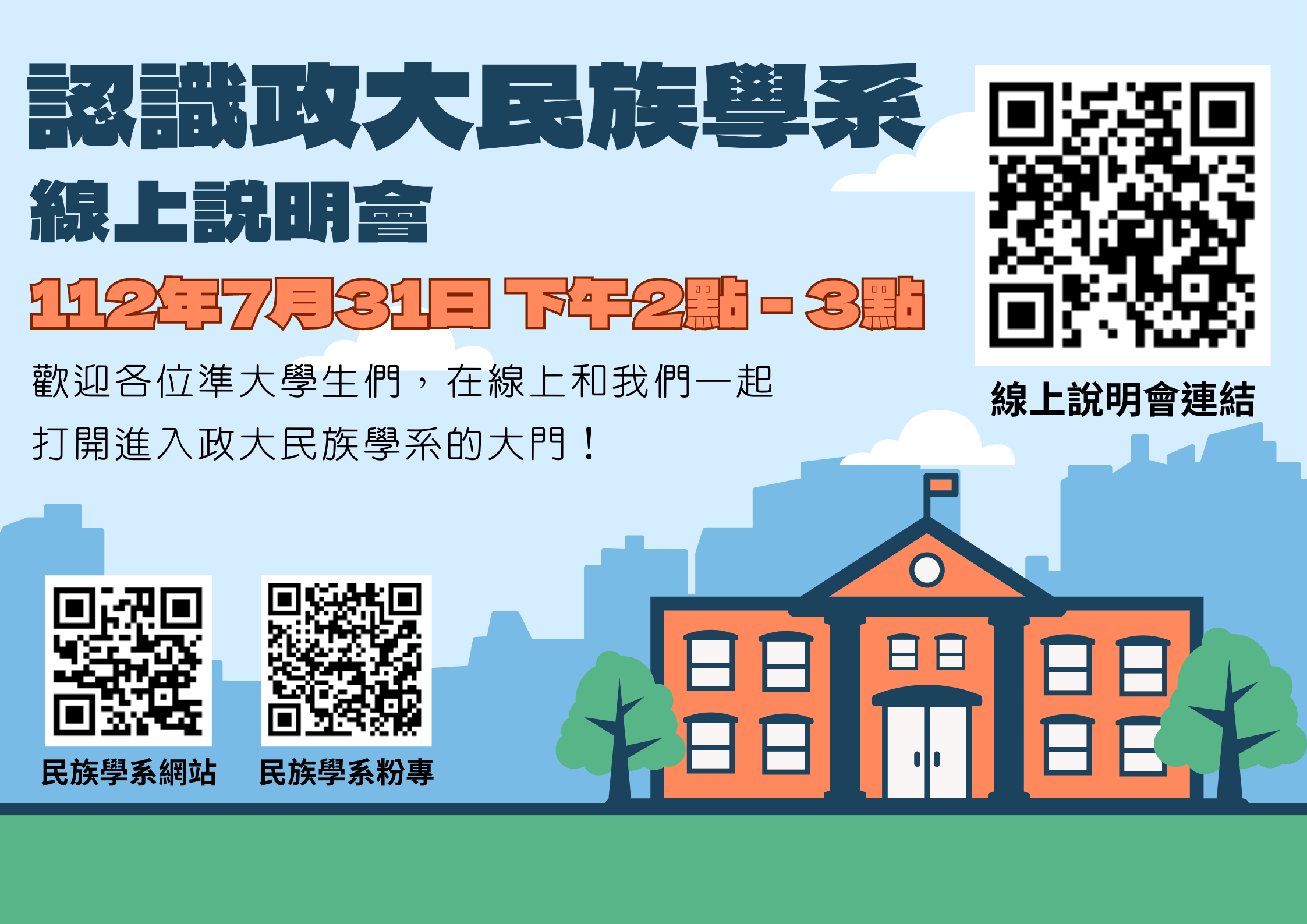 一、本校民族學系為全台唯一系所,為使高中端對民族學之學科領域、社會價值有更多認識;對學系課程師資、教學資源有更多瞭解;對本系學生特質、畢業後發展有更清楚的方向,故舉辦線上說明會。