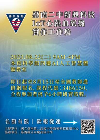 轉知國立臺南第二高級中學新興科技推廣中心辦理「新興科技IoT心跳血氧機實作工作坊」