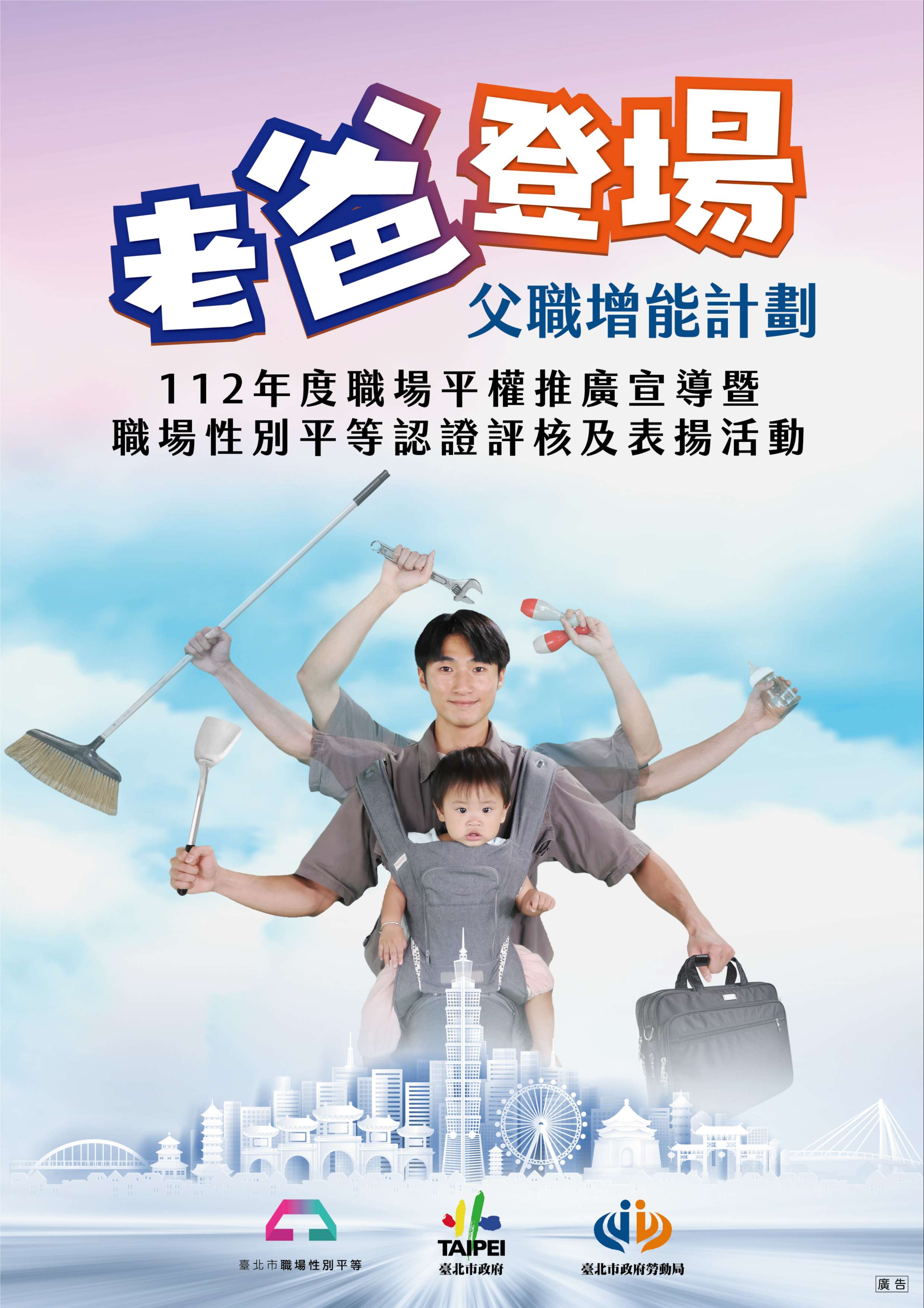 二、本案係宣導職場平權(依性別工作平等法規定,男性可申請陪產檢及陪產假7天、育嬰留職停薪及家庭照顧假等權益)及父職增能(依海報意象宣導父親不僅具上班功能,亦應負擔家庭事務及照顧卑親屬之能力)等相關觀念。。
