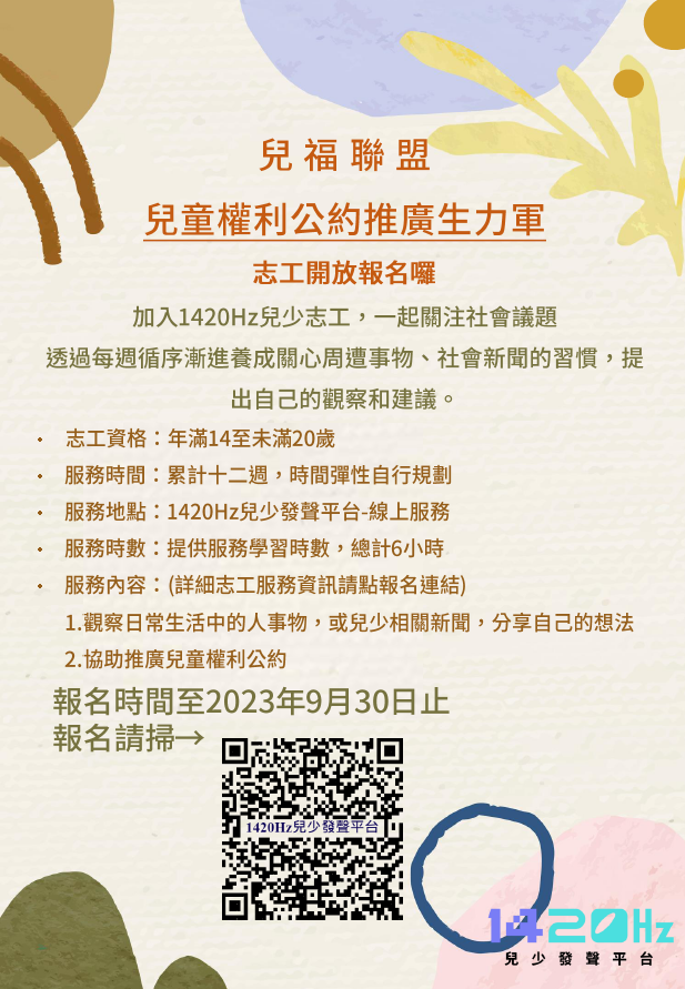 一、兒福聯盟長期致力於推廣及保障兒童權利,邀請兒少成為「兒童權利公約推廣生力軍」志工,透過線上學習認識兒童權利,將學習轉化為行動,並推廣兒童權利公約。
