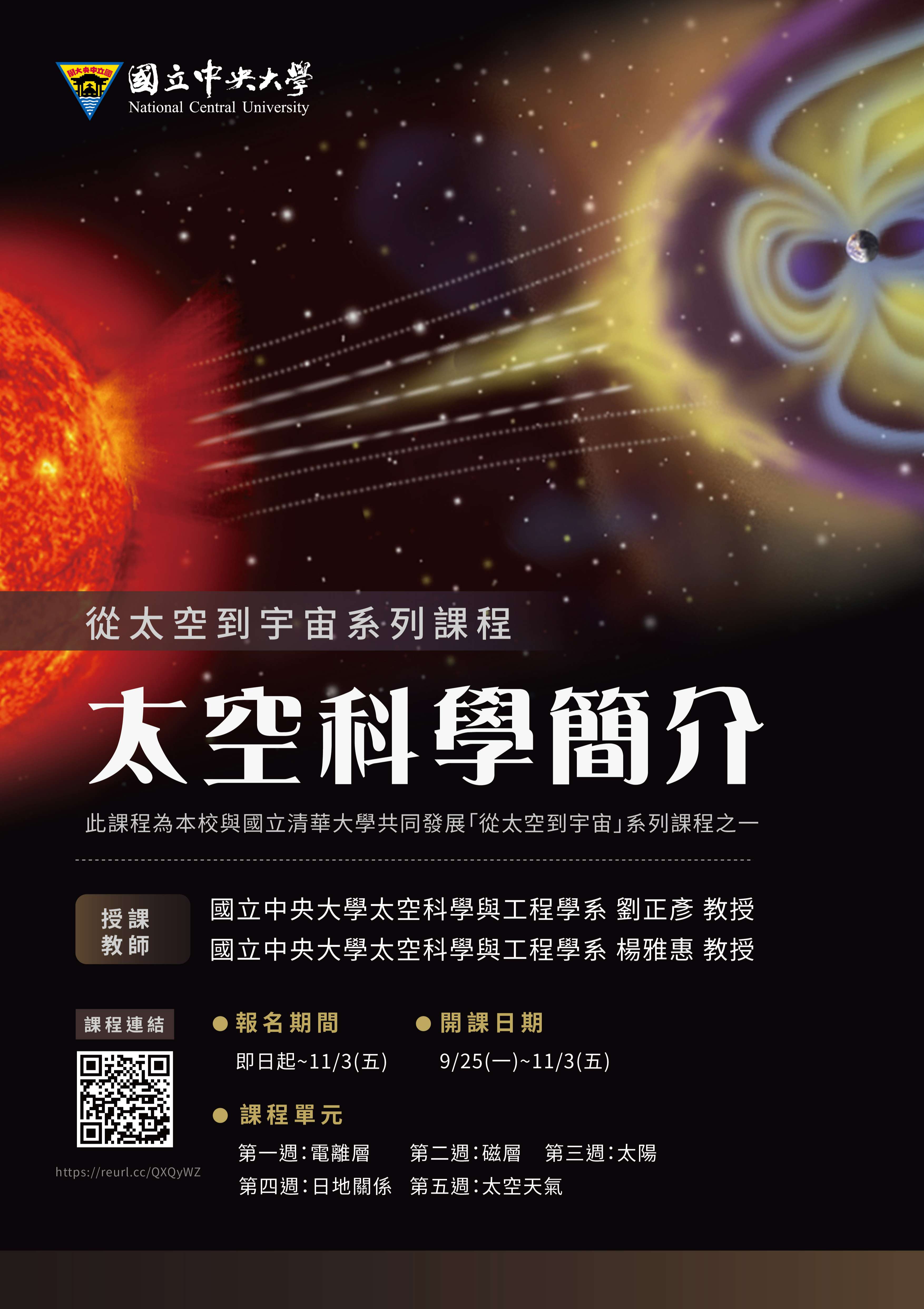 國立中央大學「太空科學簡介」磨課師課程將於清華磨課師平台開課, 即日起開始報名,開課期間112年9月25日至112年11月3 日,為本校與國立清華大學共同發展「從太空到宇宙」系 列課程之一,歡迎有興趣之師生踴躍報名參加, 詳細資訊請見附件檔案,謝謝~