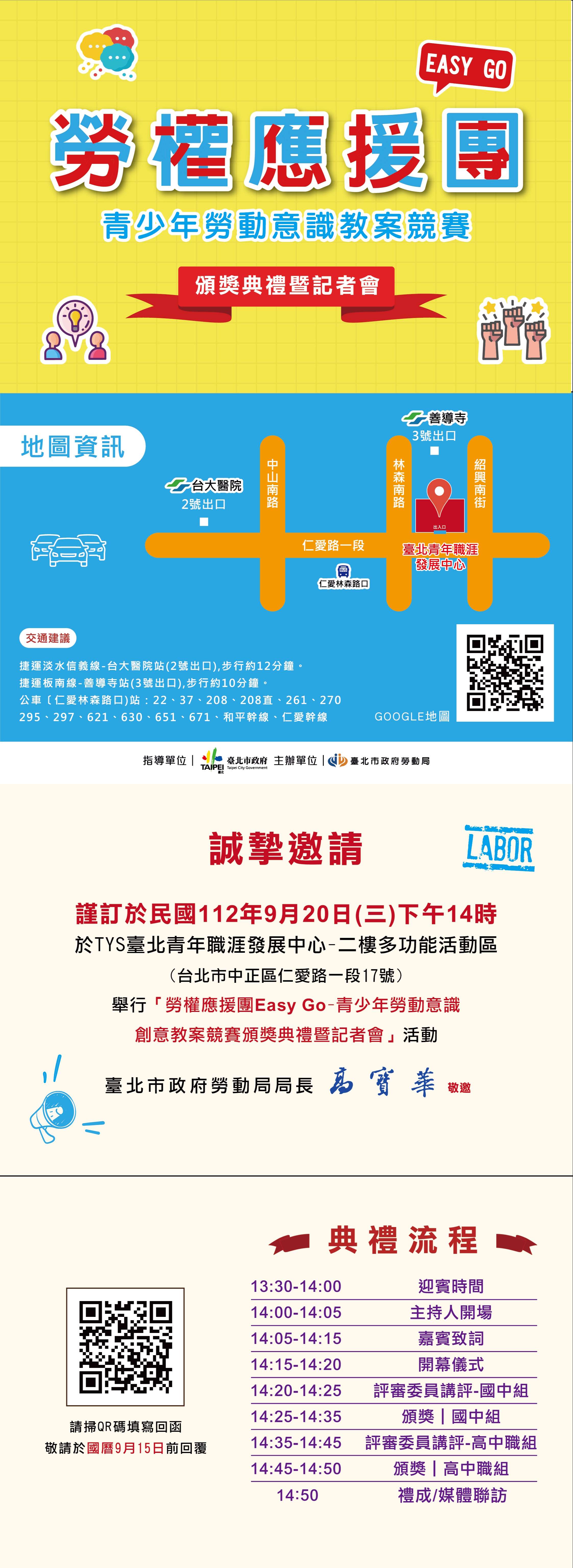 (一)名稱:「勞權應援團EASY GO」青少年勞動意識教案競賽 頒獎典禮暨記者會。