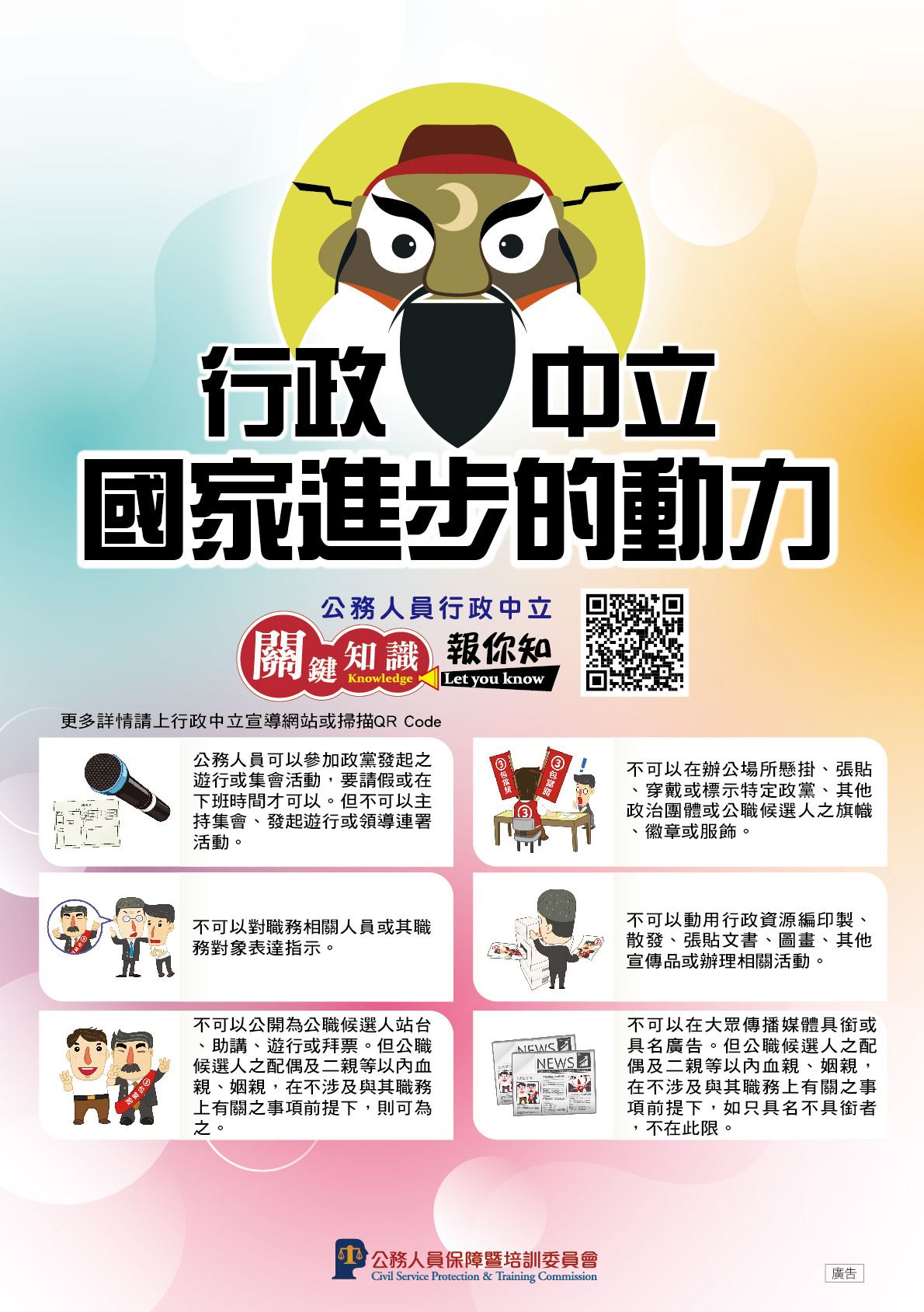 四、另保訓會為因應前開選舉將屆,製作旨揭行政中立實務案例宣導手冊、宣導海報及告示說明等行政中立文宣電子檔,均置於保訓會全球資訊網之「行政中立專區/公務人員行政中立訓練及宣導/圖像及影音電子檔」項下(連結網址),請同仁自行下載參考運用,以強化自身對於行政中立之瞭解,並請同仁應於上班或勤務時間嚴守行政中立。