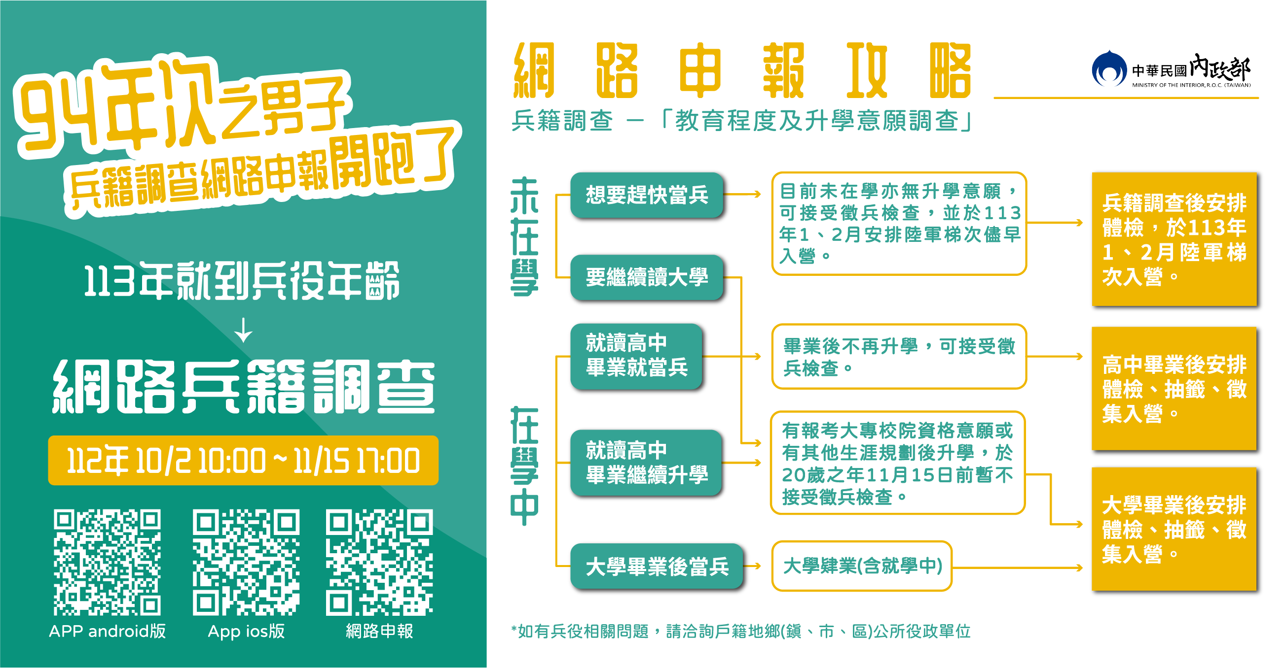 二、中華民國男子依法皆有服兵役之義務,須在19歲徵兵及齡前一年底至當年2月間接受兵籍調查,建立兵籍資料。94年次男子明年屆徵兵及齡,於112年10月2日上午10時至11月15日下午5時,可使用戶役政管家APP「下載登入戶役政管家APP/役政/線上申辦/我要申請」(戶役政管家APP QR Code如附件)或由內政部役政司網站首頁/主題單元/點選連結進入「兵籍調查線上申報」作業系統(網址:https://www.nca.gov.tw/ris/),登錄兵籍表所需之個人資料後即可完成兵籍調查作業。