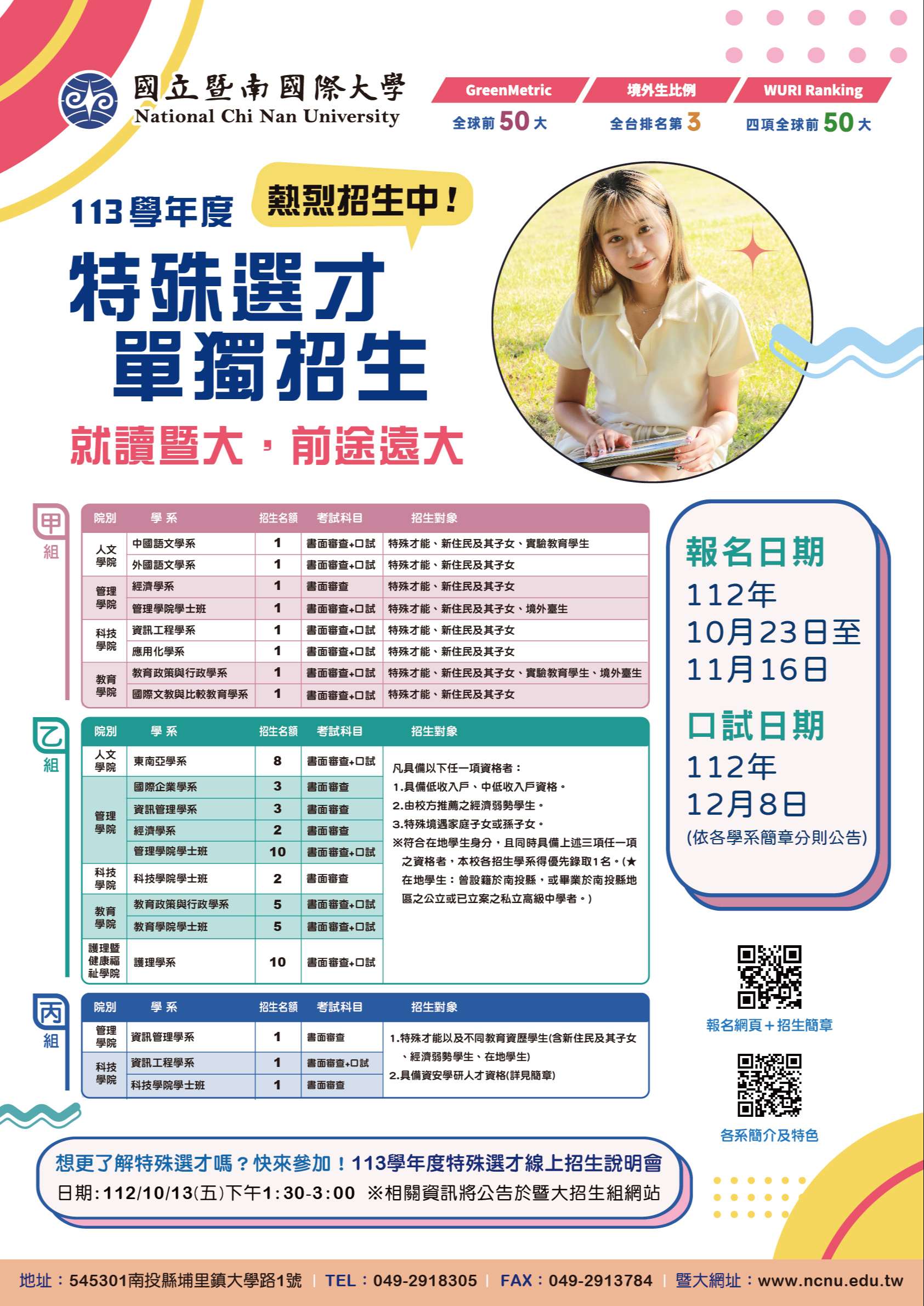 (一)甲組(一般生組):特殊才能或不同教育資歷學生(含新住民及其子女、實驗教育學生與境外臺生)。
